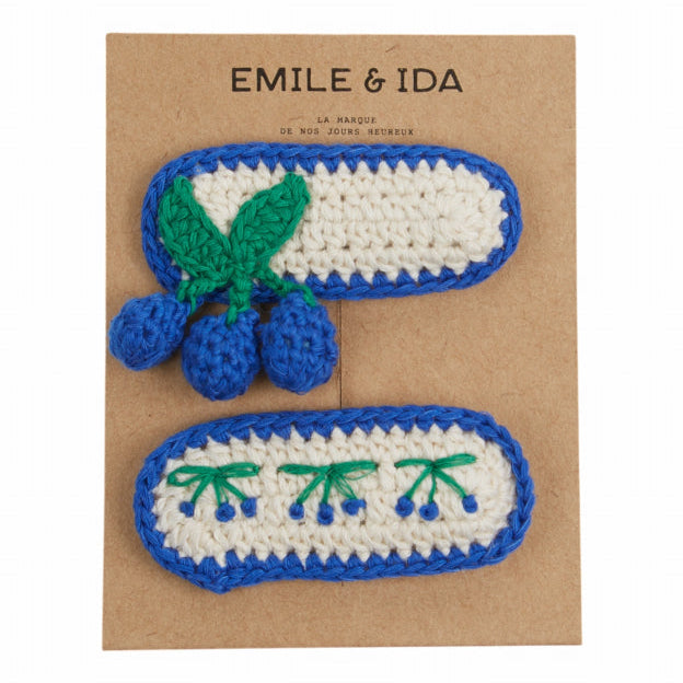 Two cherry-themed hair clips. Lovingly hand-crocheted by Indian artisans.