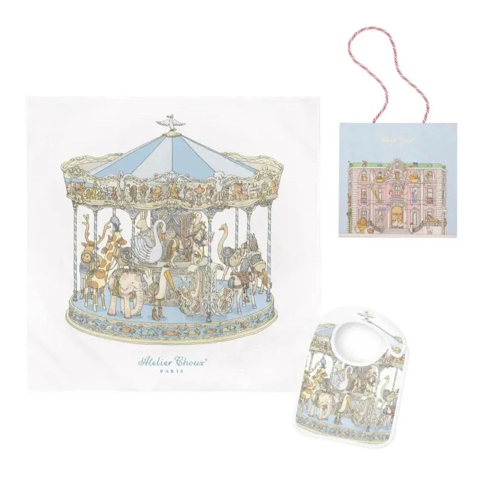 Atelier Choux Paris Organic Cotton Carrés & Bib Gift Set, Carousel Blue