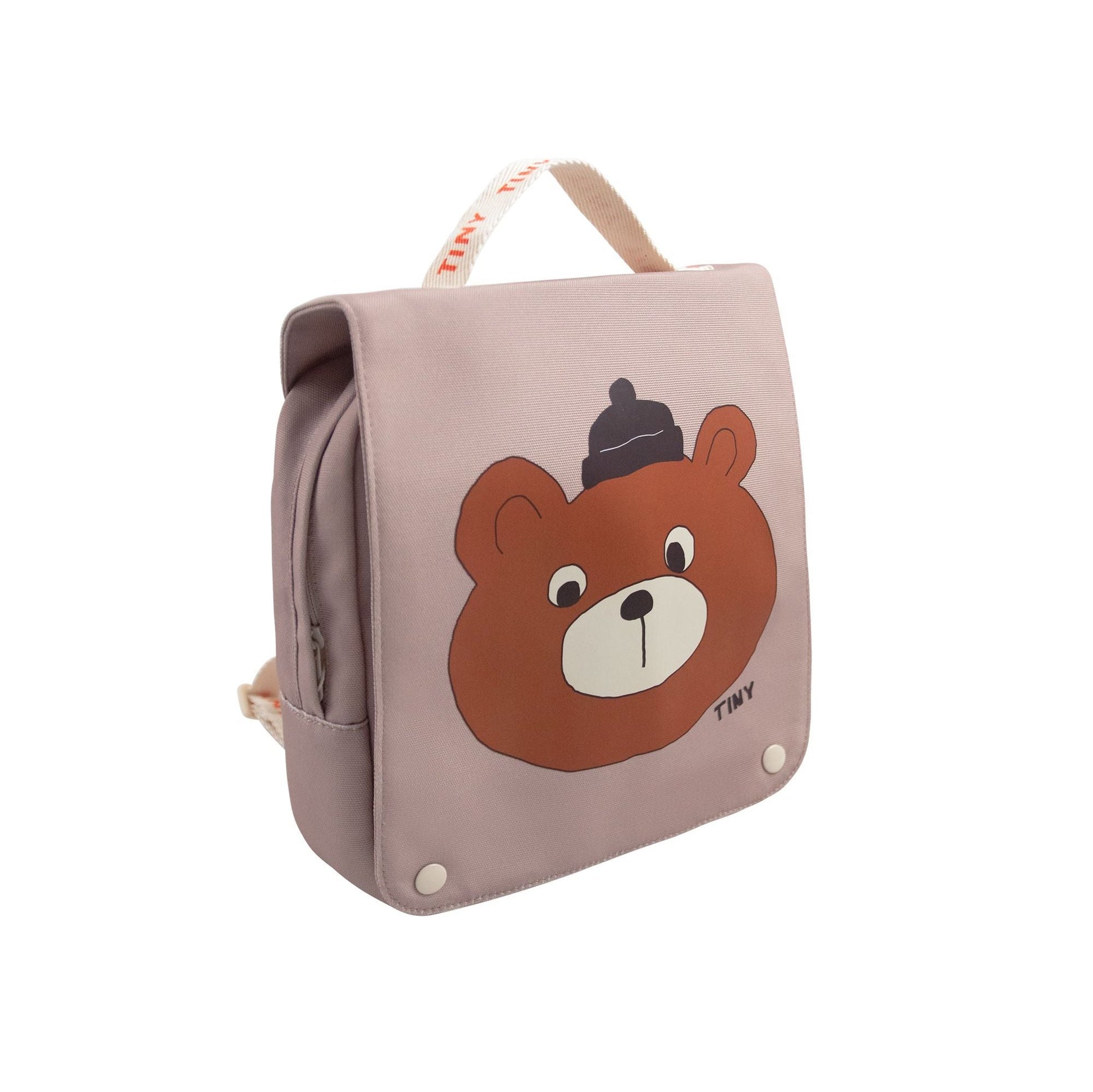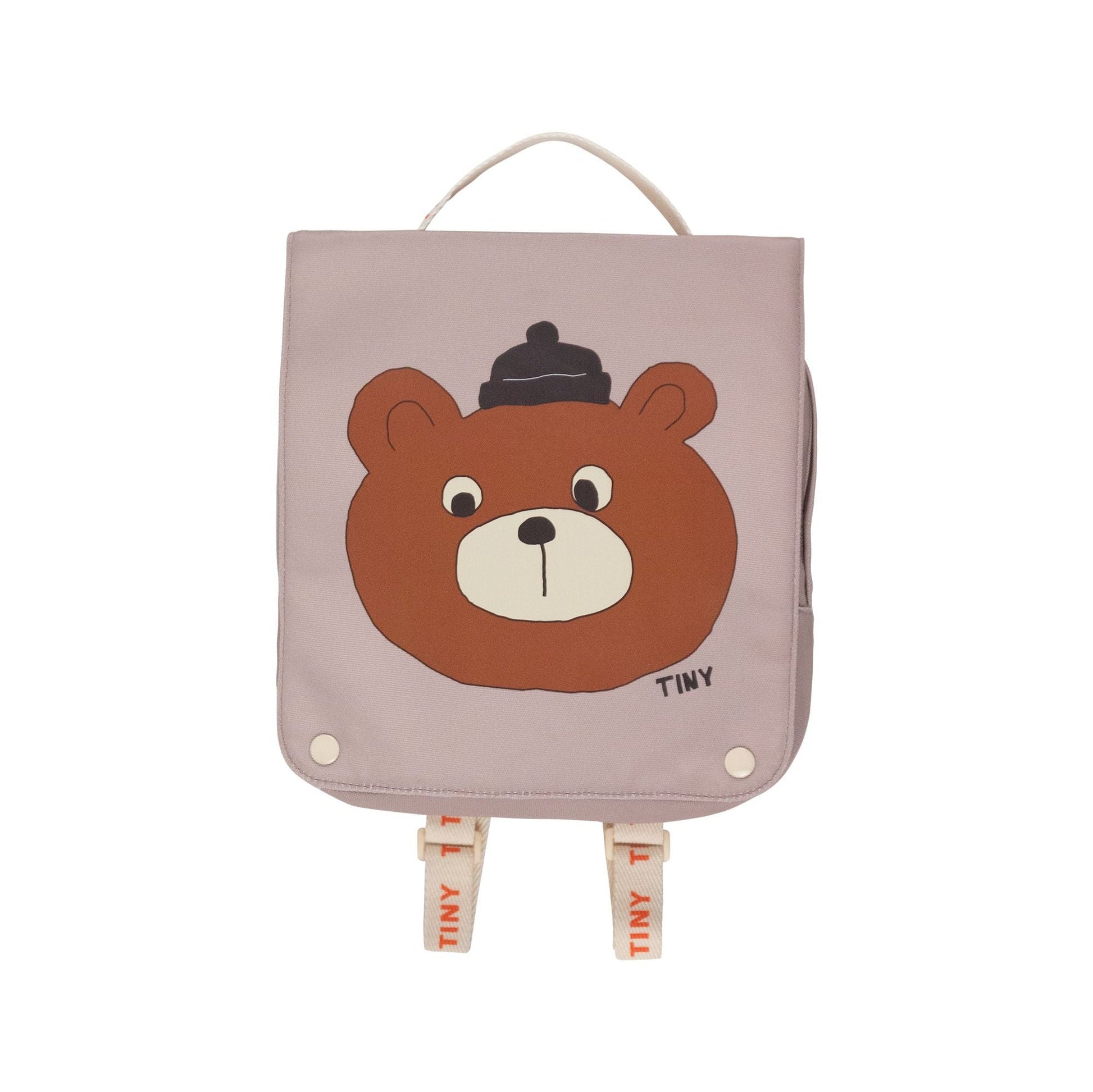 This bear graphic toddler backpack in taupe is designed with two back straps and a handle at the top. It has a large compartment for school stuff or a day of adventures.