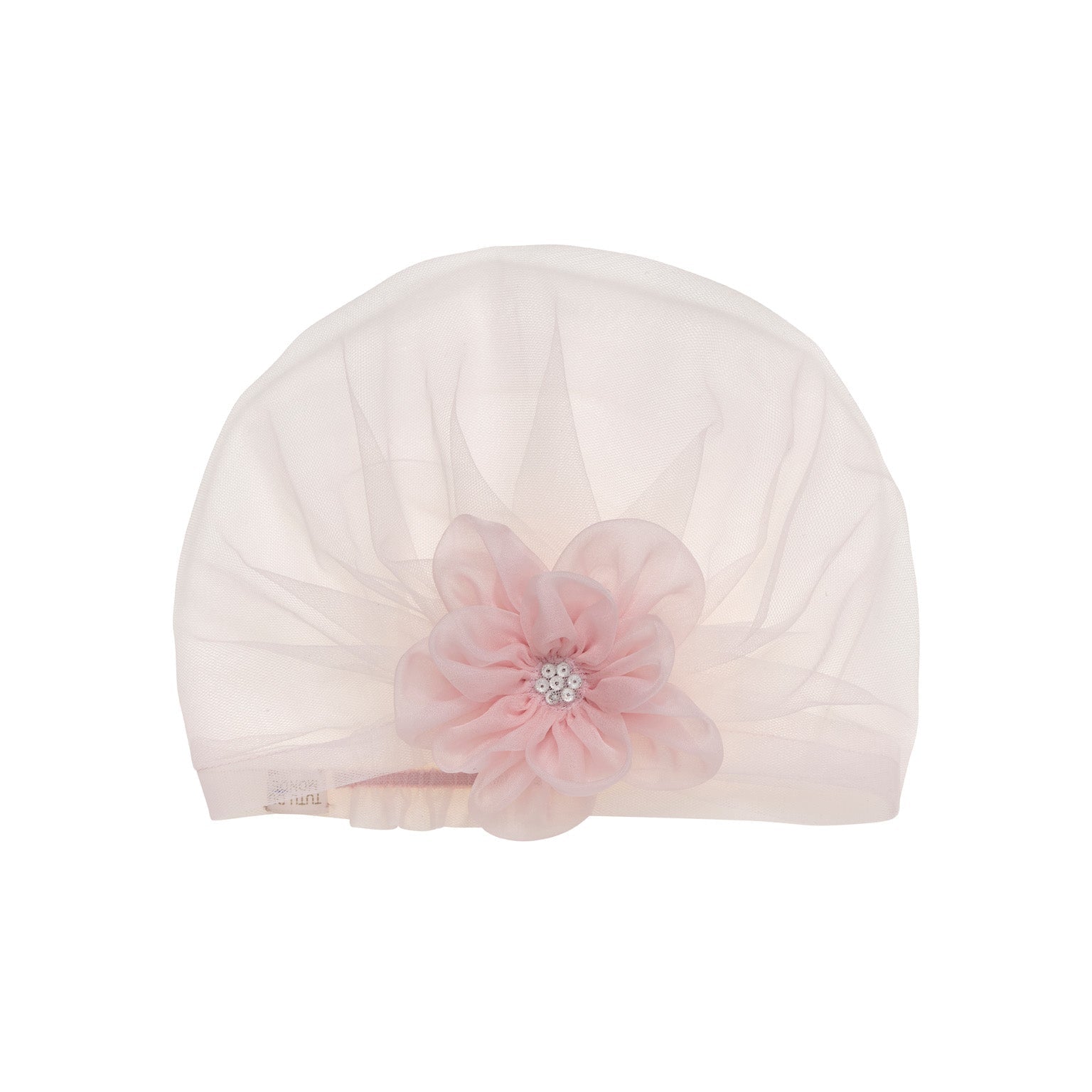 Sprinkle a little magic with the Bébé Daisy Dream Turban in Heavenly Pink. This classic piece is made of layers of our sumptuous signature fine tulle gathered in the center, with a flower crafter from soft tulle studded in the centre with a cluster of sparkling crystals.
