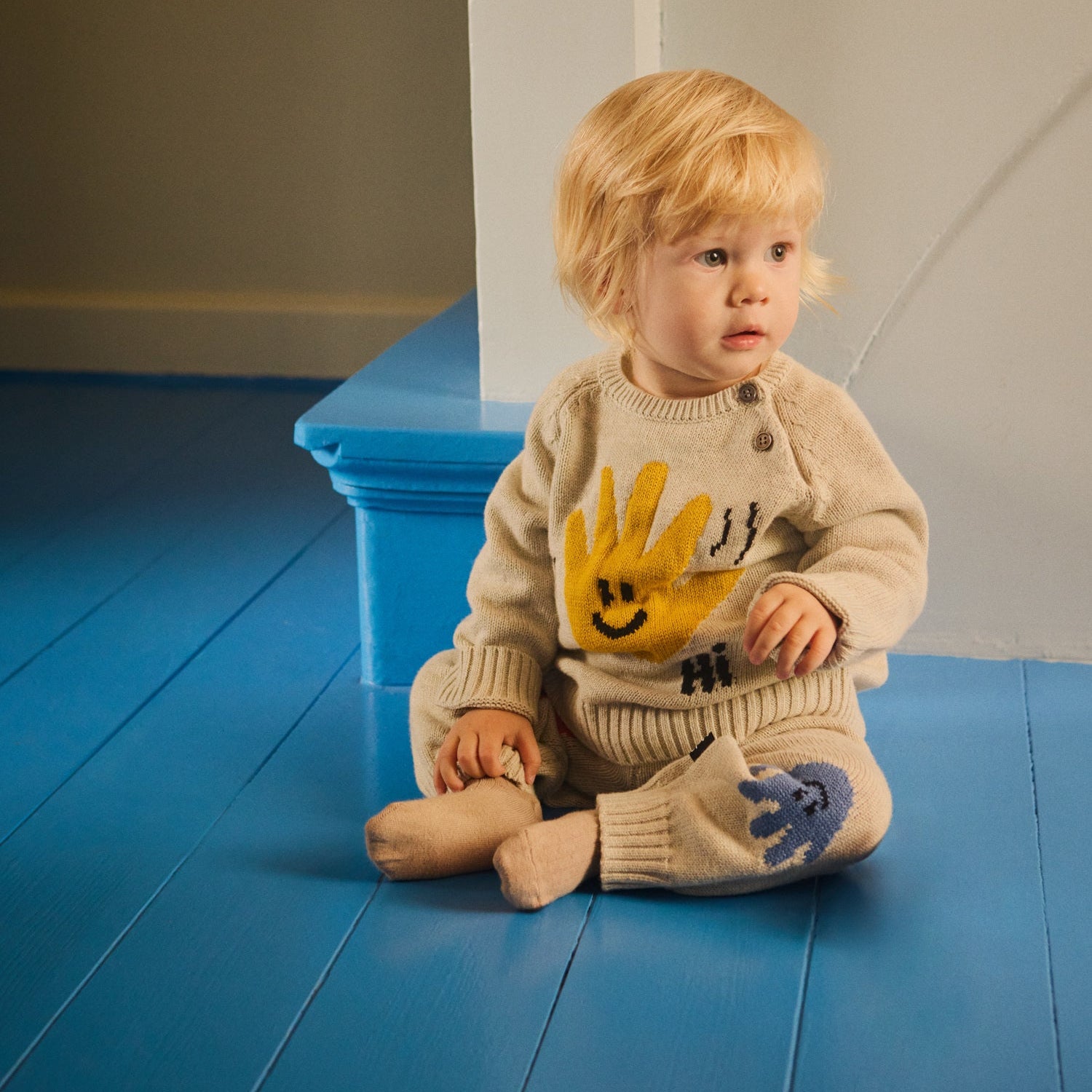 Beige knitted sweater for the little ones made of a soft cotton and wool blend with smiling hands on the front and back.