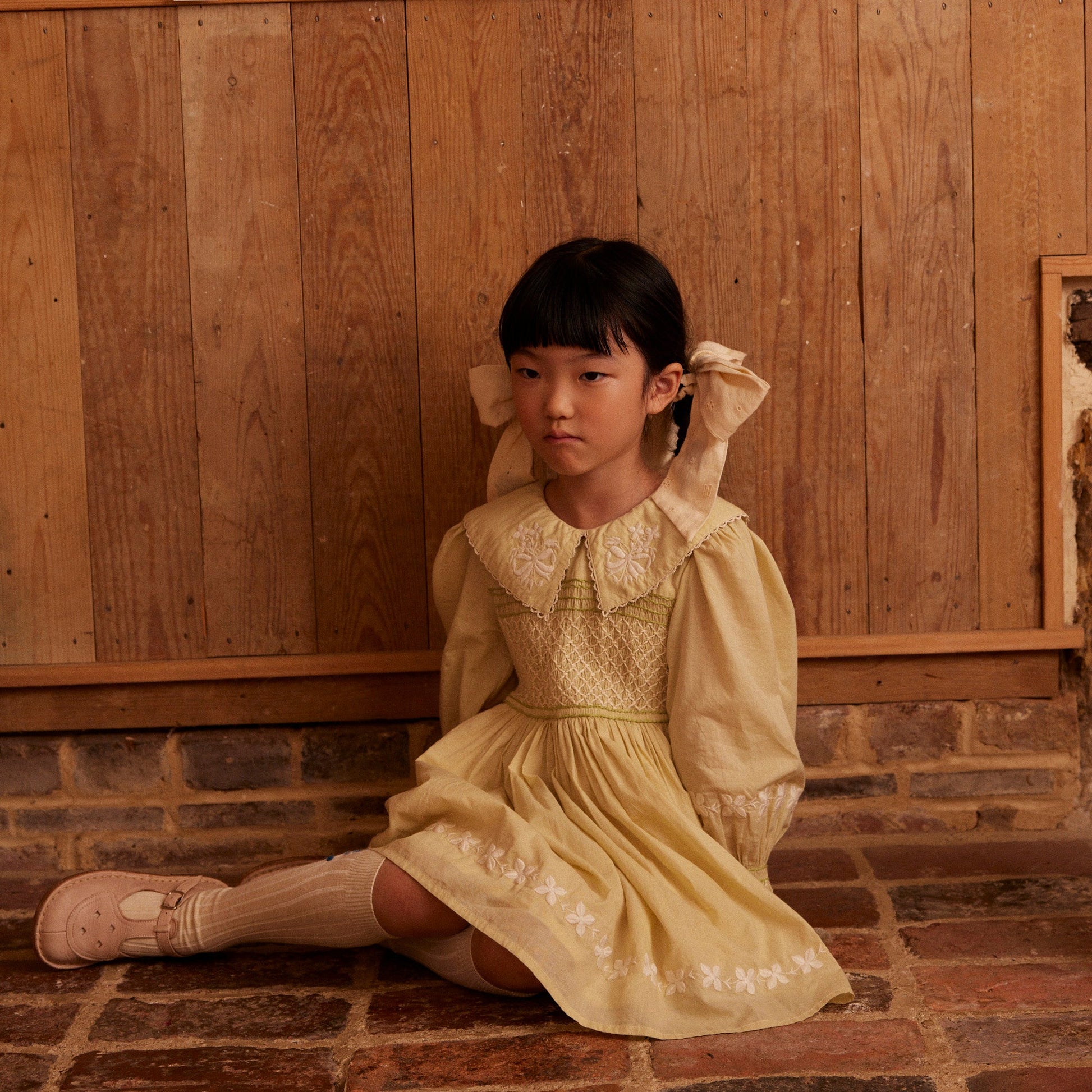 New this season, the ethereal Carey dress is crafted from our soft and light cotton cambric, with an organdie lining to her skirt for a sweet vintage silhouette. Featuring gently puffed sleeves with smocked cuffs, smocking at chest, hand finishing and pretty bow embroideries to her contrast collar. Invisible zip closure at back. Carey is made for special occasions, we love her worn with boat shoes for an effortlessly elevated look.