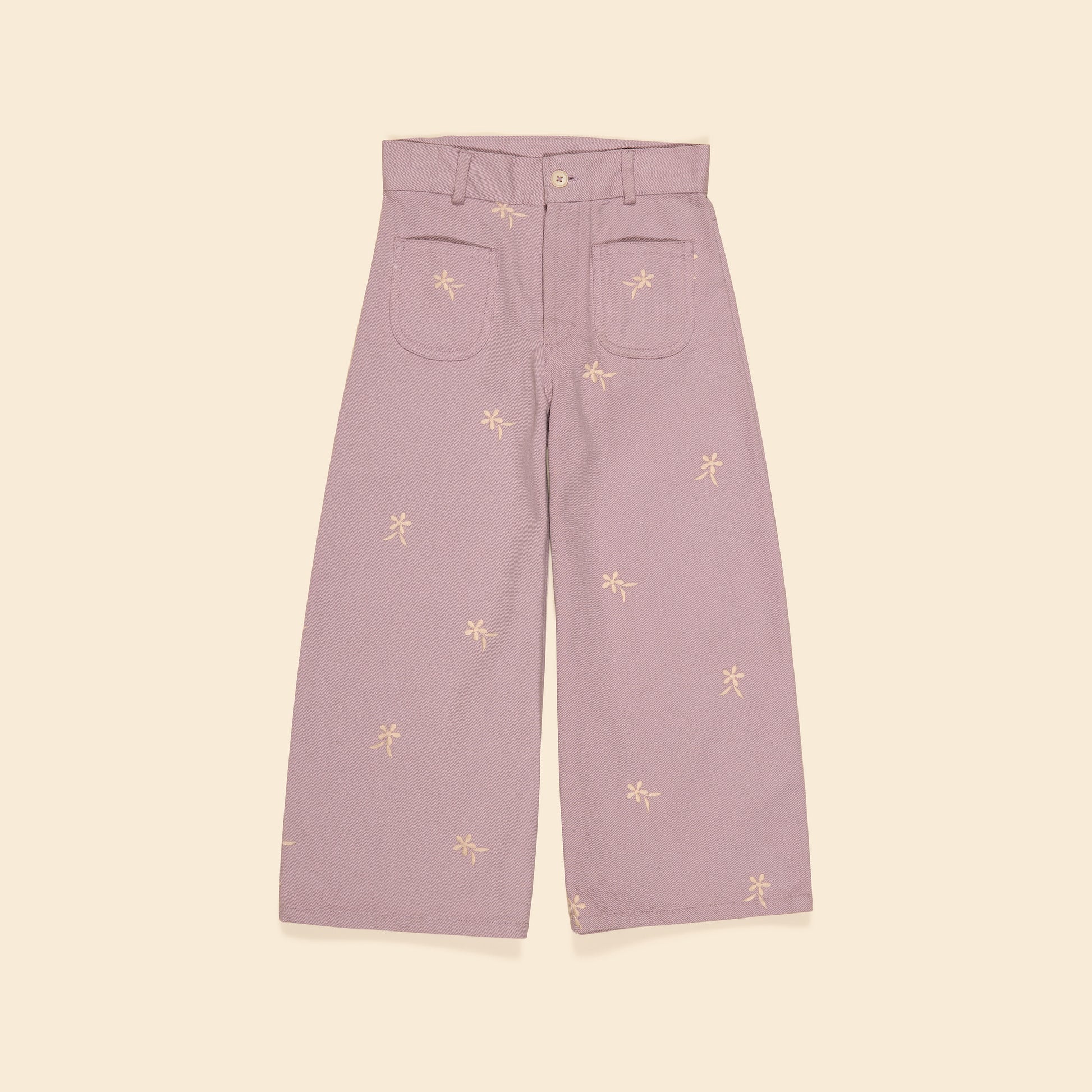 The Casey jean is a ‘70s style high-waisted jean in our ‘lilac-grey’ cotton denim, with contrast blue feather stitch embroideries at pockets and hem. Featuring adjustable waist with button closure and three small button placket. With a slight flare, Casey brings effortless vintage style – we love her worn with our blouses or Rumi tee and sandals.