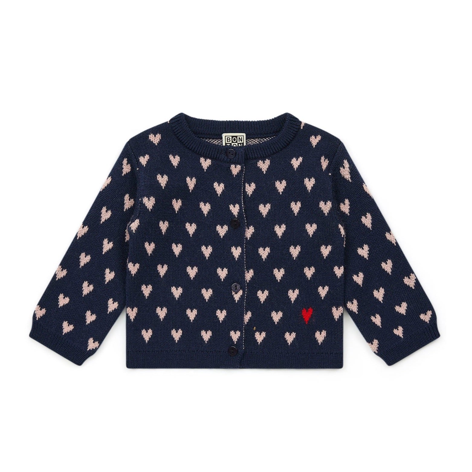 Knitted in double jacquard, the MYLOVE cardigan will transport you with love this season. With its pretty navy and pink hearts, you can't help but fall for it.