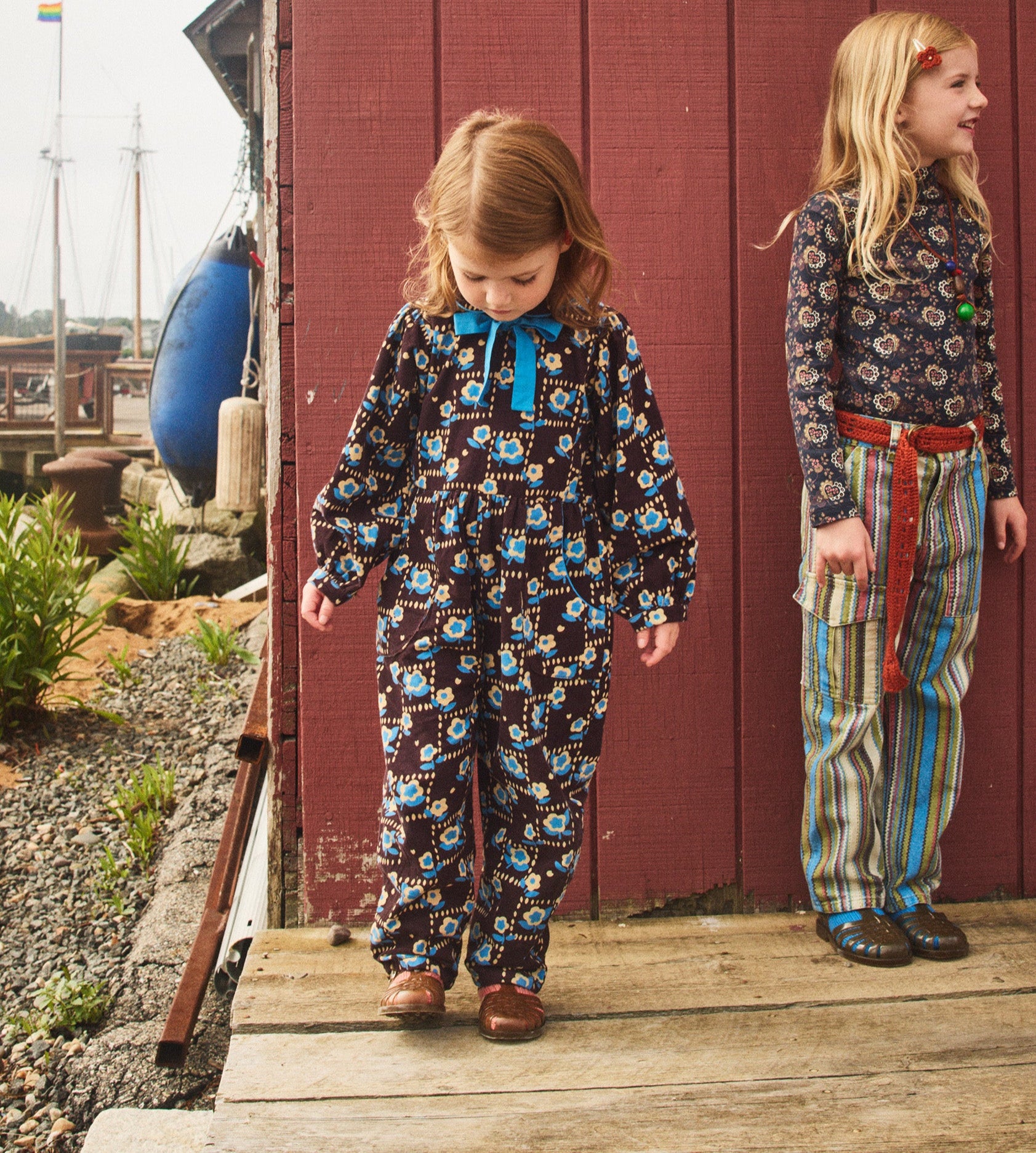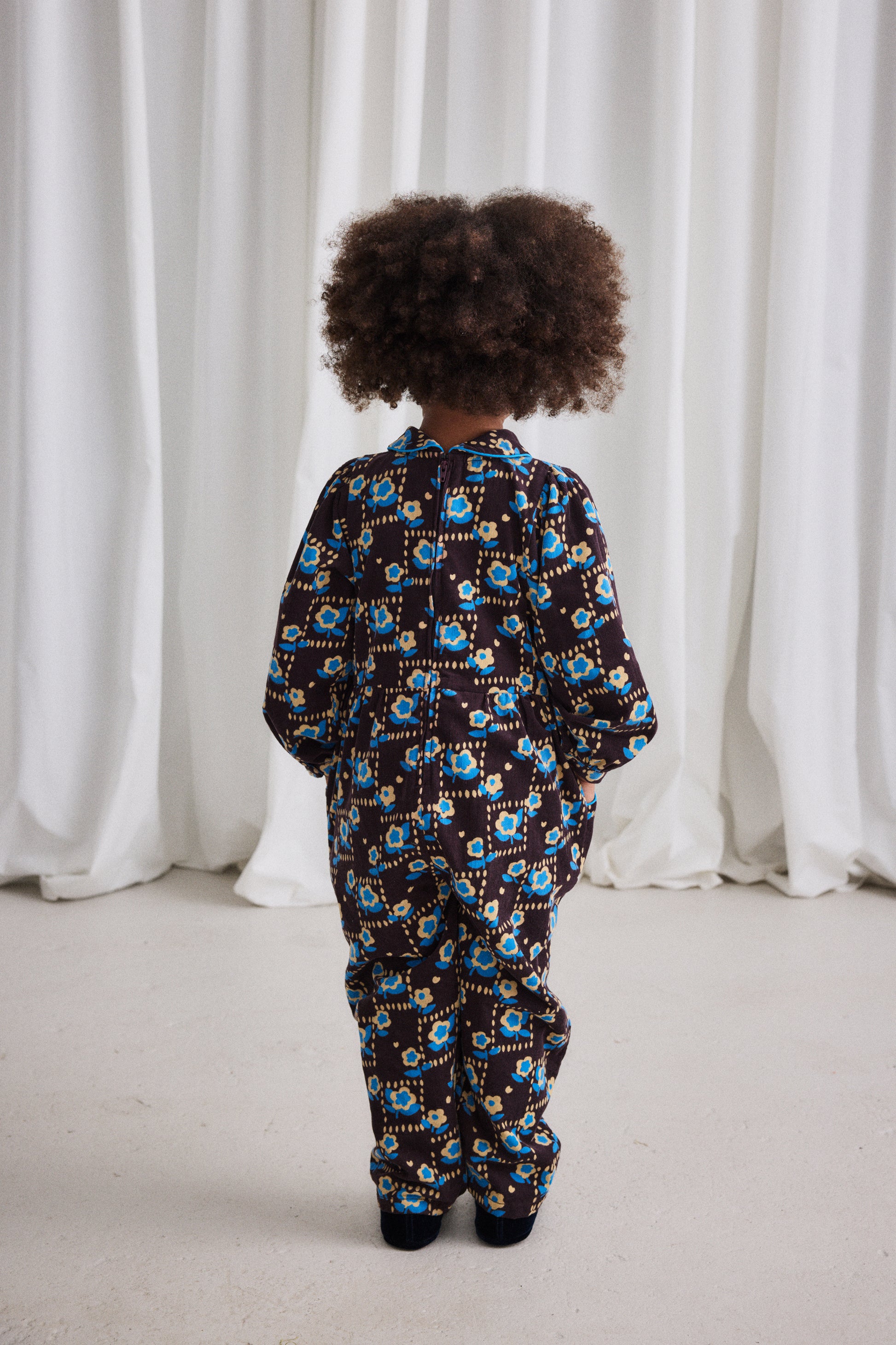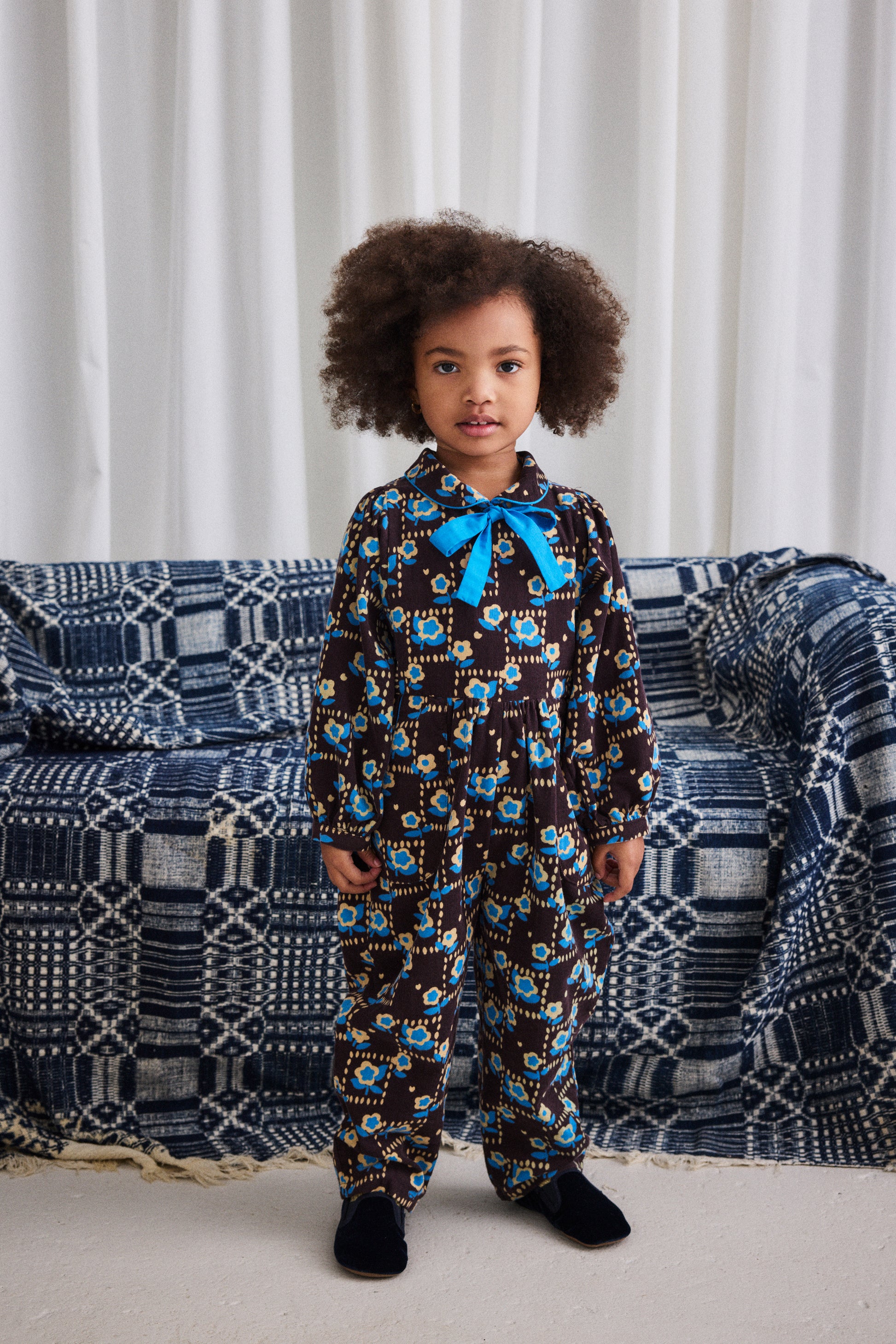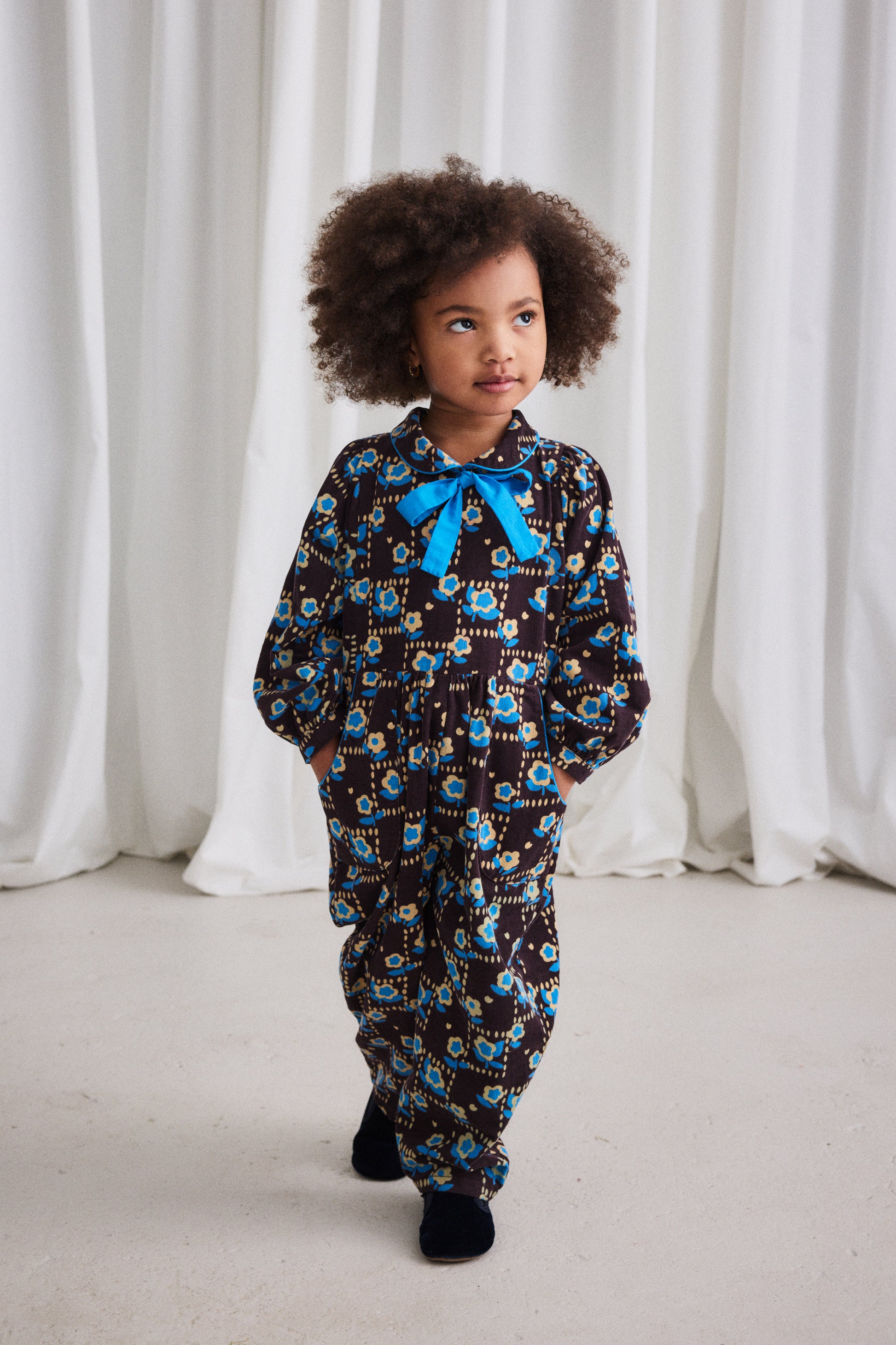 A peplum-style long-sleeved top in fine wale cotton corduroy that lends itself to a nice drape. Featuring blouson sleeves, a rounded collar with contrast trim, and a bow at the center front.