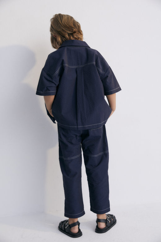Corinto Pant in navy seersucker fabric, 100% cotton, with contrasting stitching, horizontal leg cut, and invisible closures.
