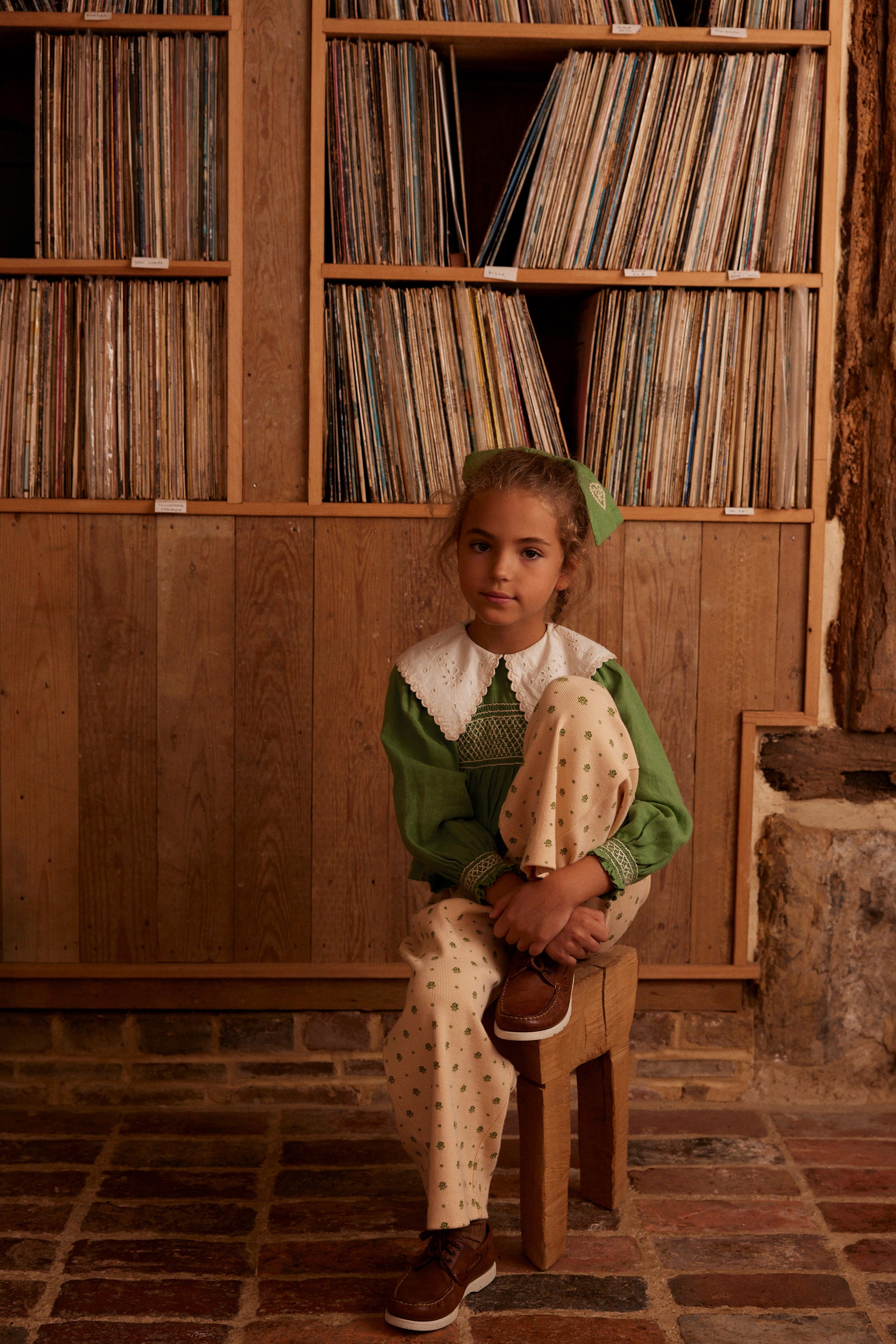 The beautiful new Cornelia blouse is crafted from our retro green linen. With an oversized broderie anglaise collar, gently puffed sleeves and contrast hand smocking at the chest that releases to a sweet shape. A pretty chain of contrast floral embroideries circle the hemline. Finished with hand smocking at cuffs and a scallop crochet trim to collar. We love Cornelia styled under dungarees or pinafores for a statement, or worn with our Molly or Wini trousers.