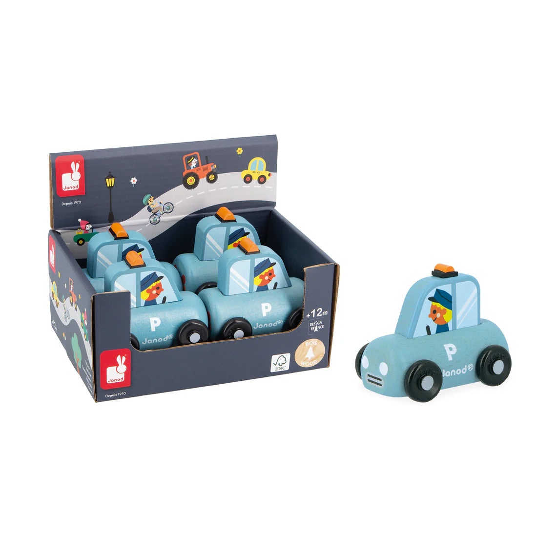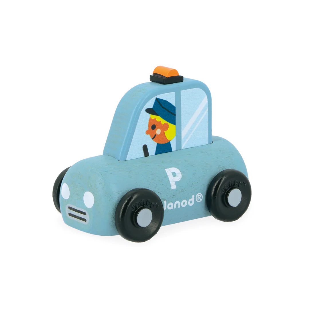 The Janod Wooden Police Car – Cross Roads is a wooden toy designed for children aged 12 months and up. This small blue car is easy to handle thanks to its design, allowing little ones to grasp it from the top to roll it. It's perfect for inventing various stories in the city, promoting imagination and motor skills development.