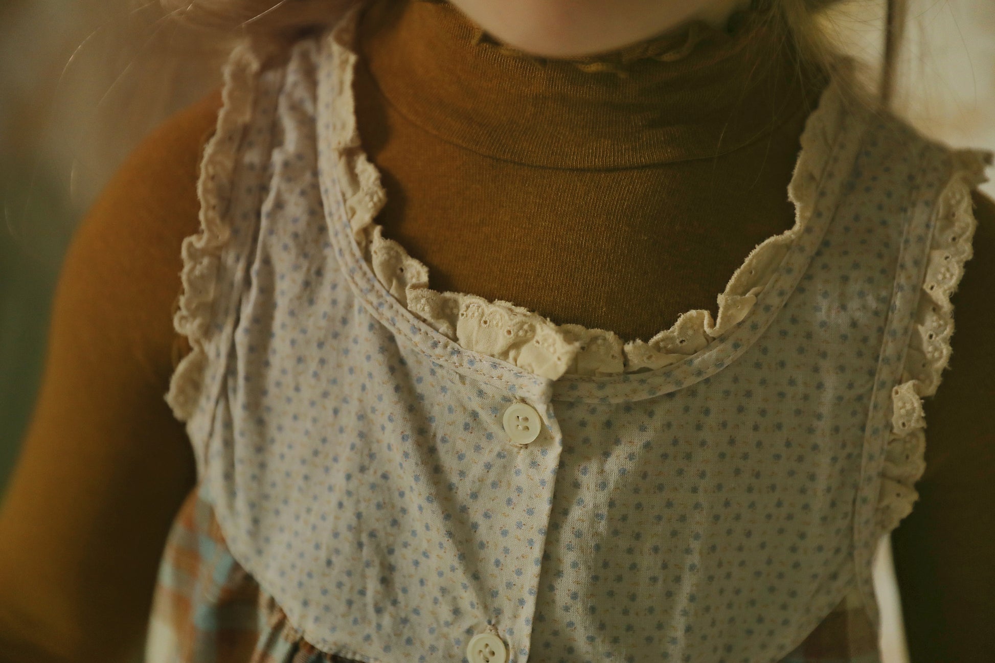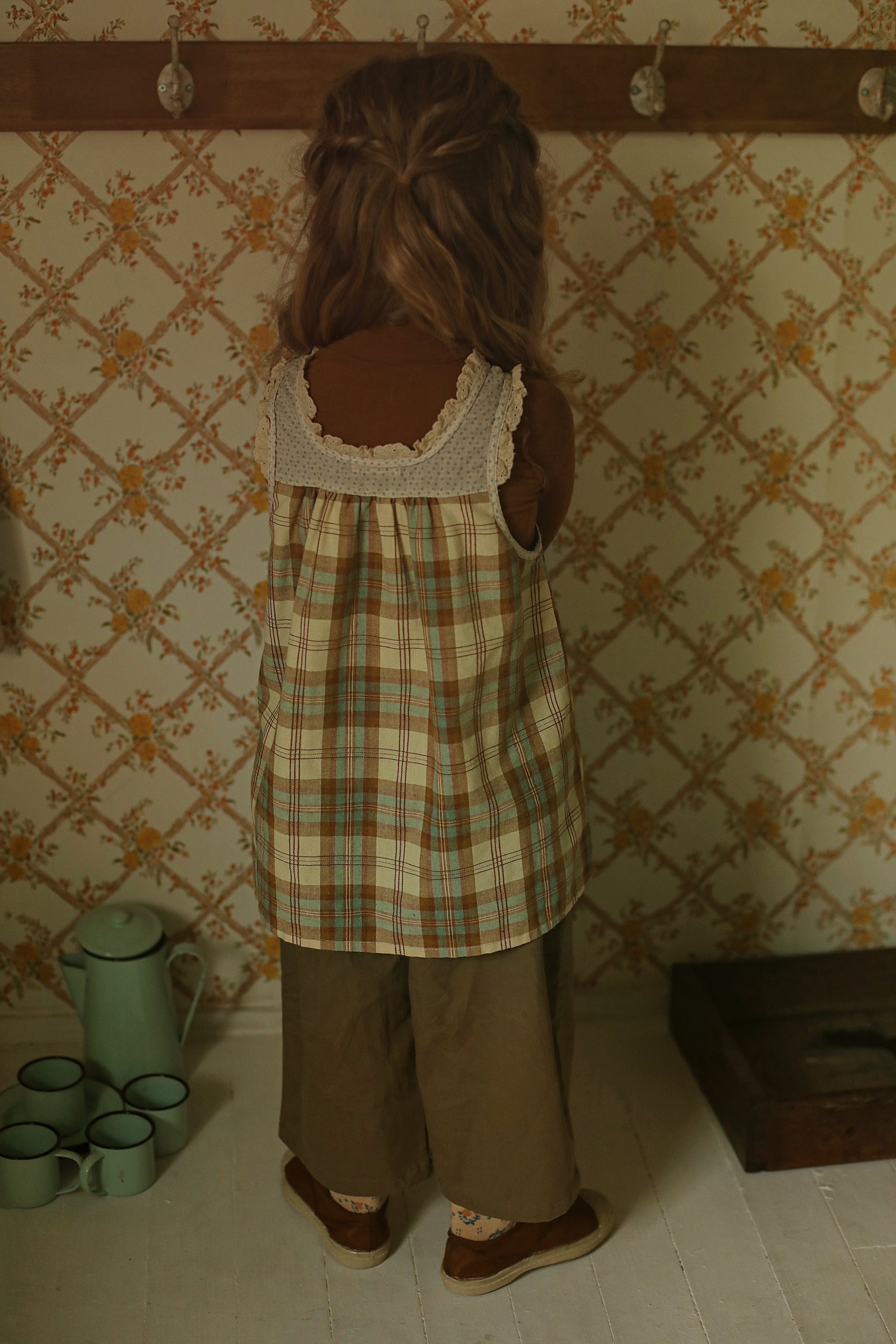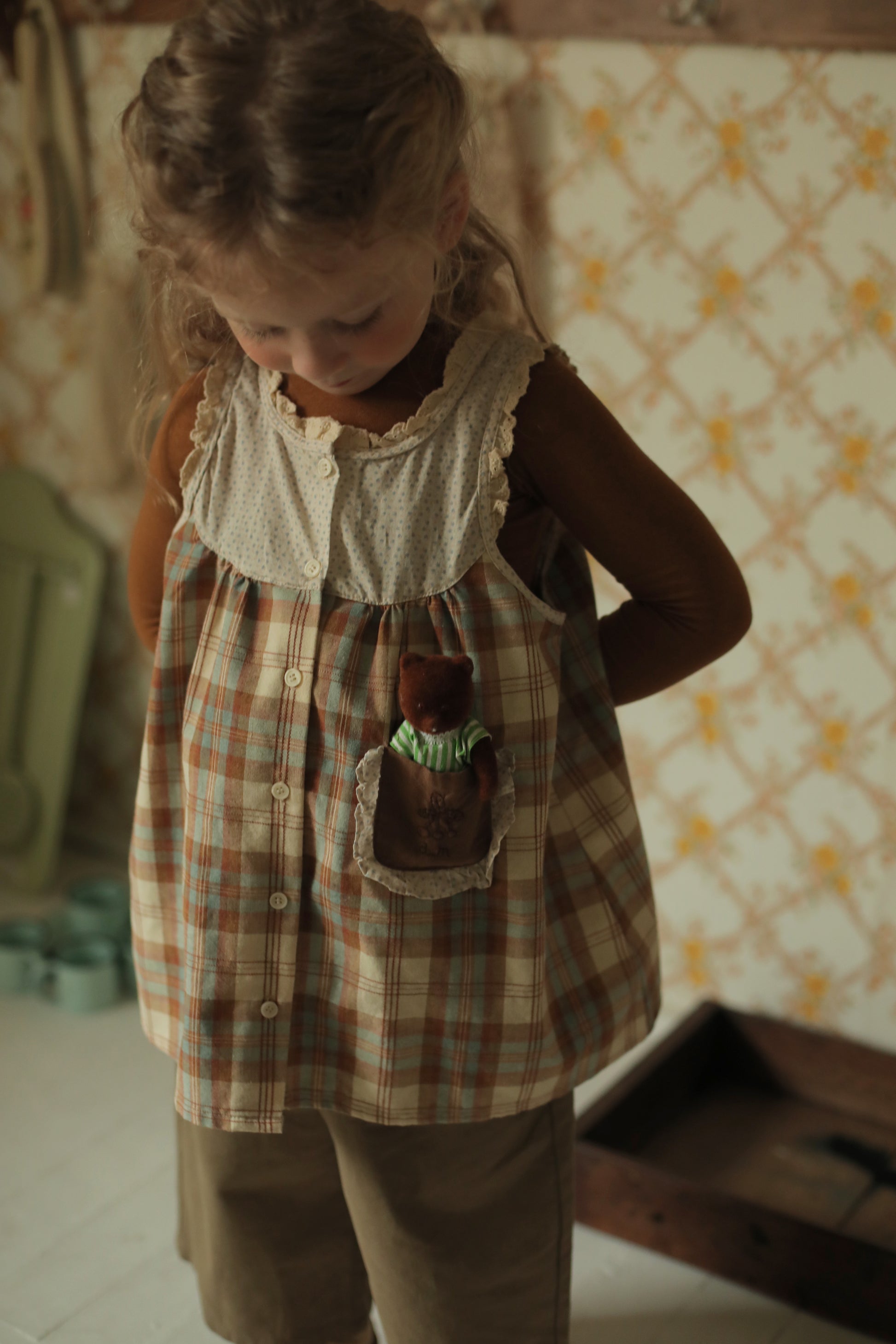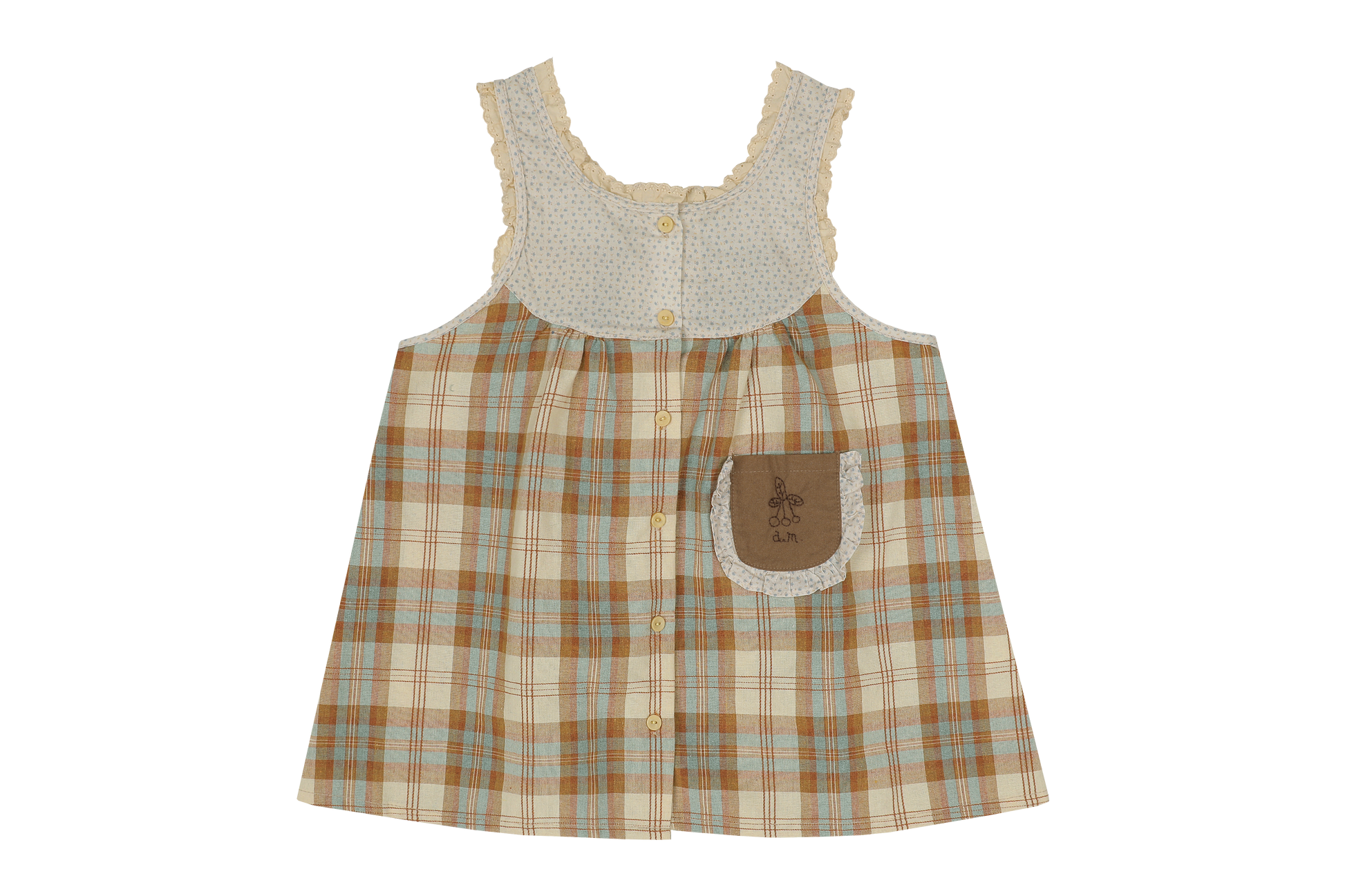 Sleeveless dress full of romantic details, perfect for layering all season or wearing alone in the summer. Features cotton lace on the hem, a mini pocket with cherry embroidery and a mix of two unique patterns.