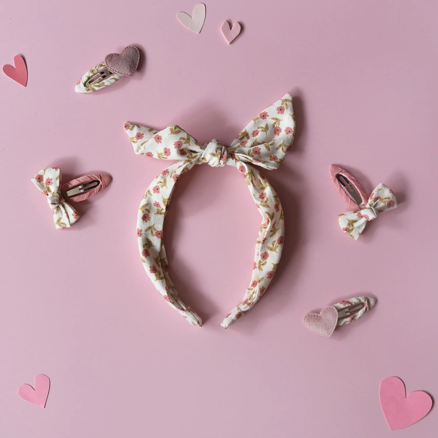 An adorable set of two hand-tied bows made from our Elsie floral fabric. Both are set on two dusky pink grosgrain ribbon wrapped snap clips.