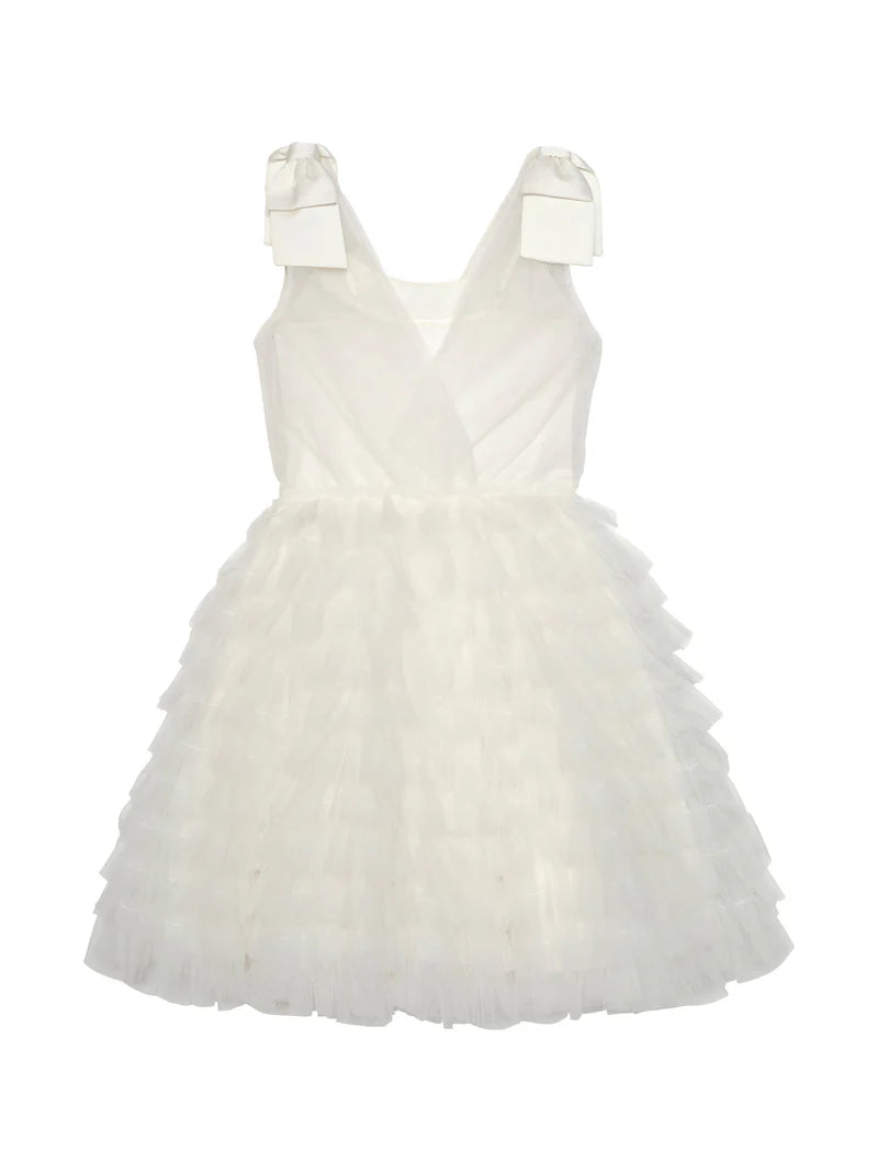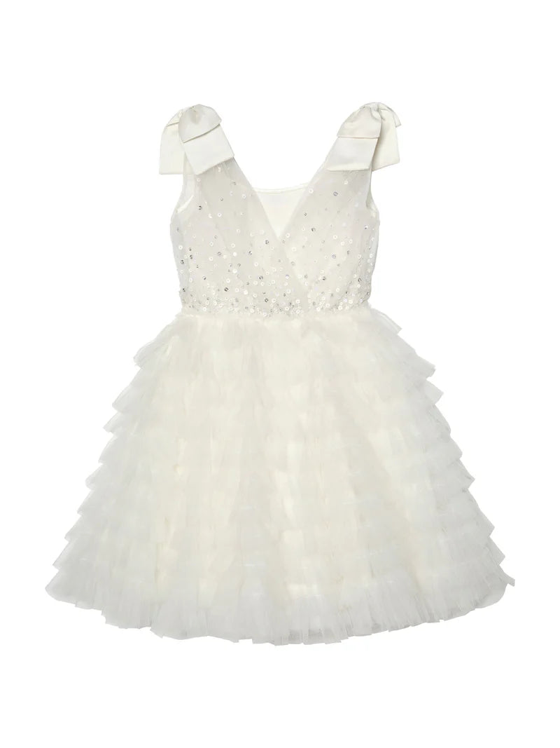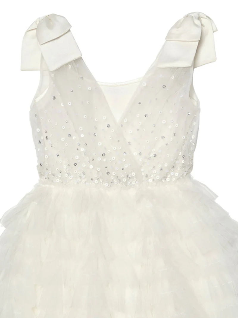 She'll be a vision in White whilst wearing the Euphoria Tutu Dress. Featuring a V shaped gathered tulle bodice studded with shimmering sequins. Cute satin bows sit delicately perched on each shoulder, adding a touch of charm and playfulness, while the multi-tiered skirt billows out into a luxurious, snowy silhouette.