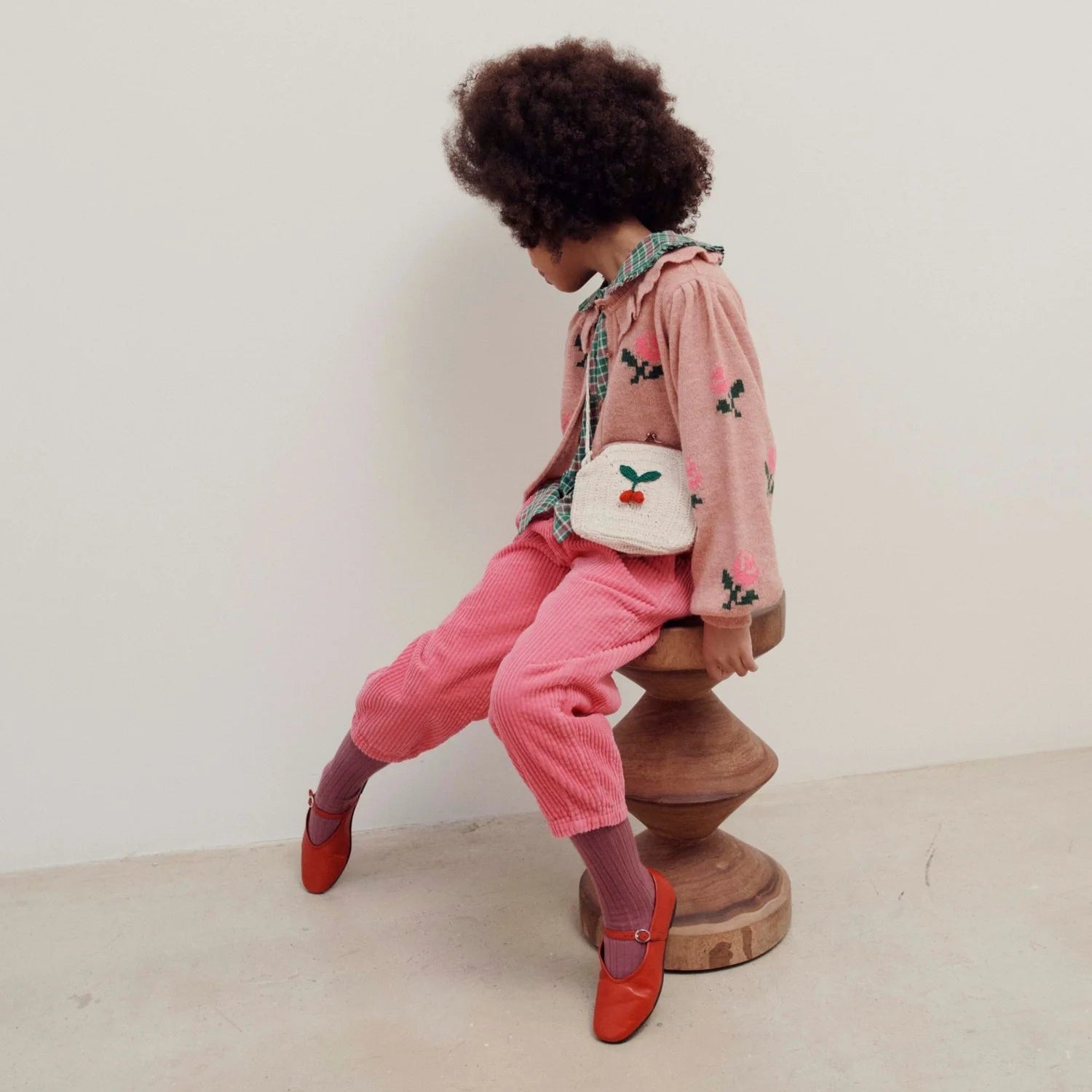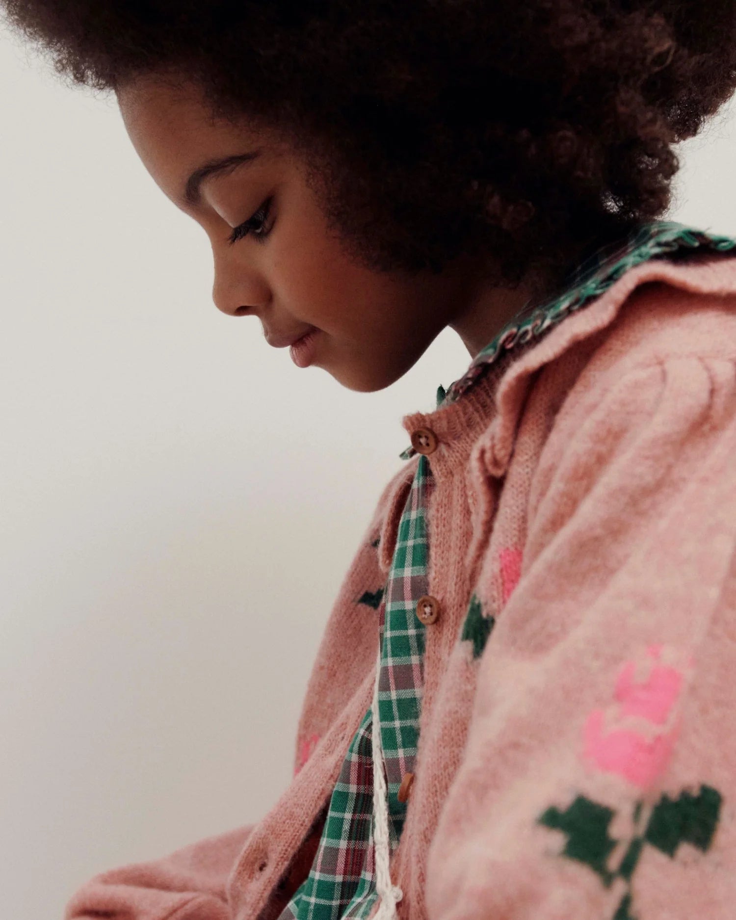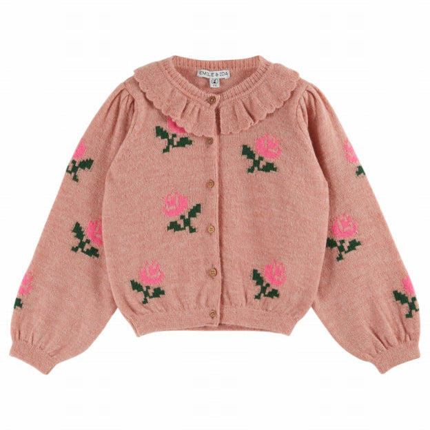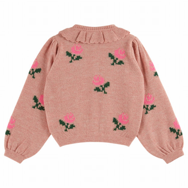 Pink mohair wool cardigan dotted with large fluorescent pink roses.