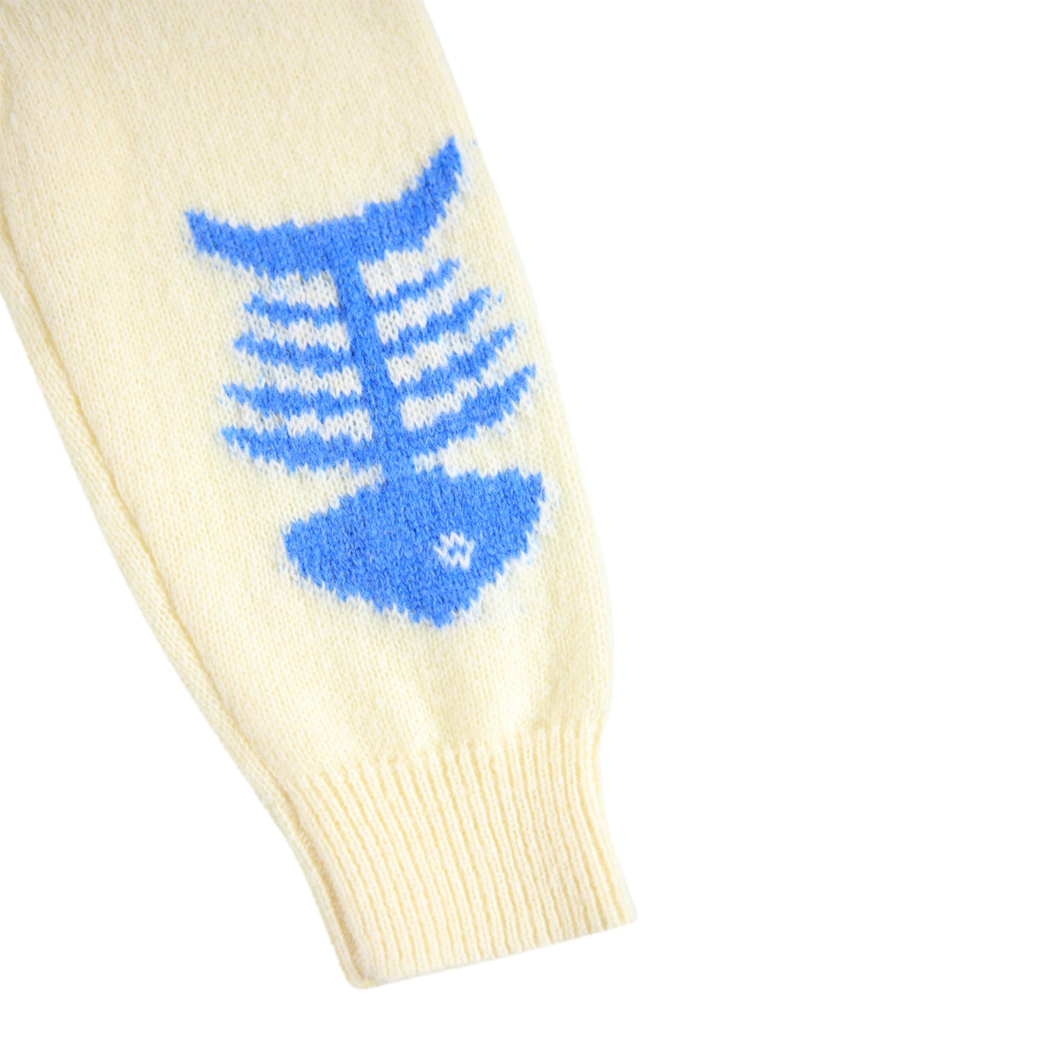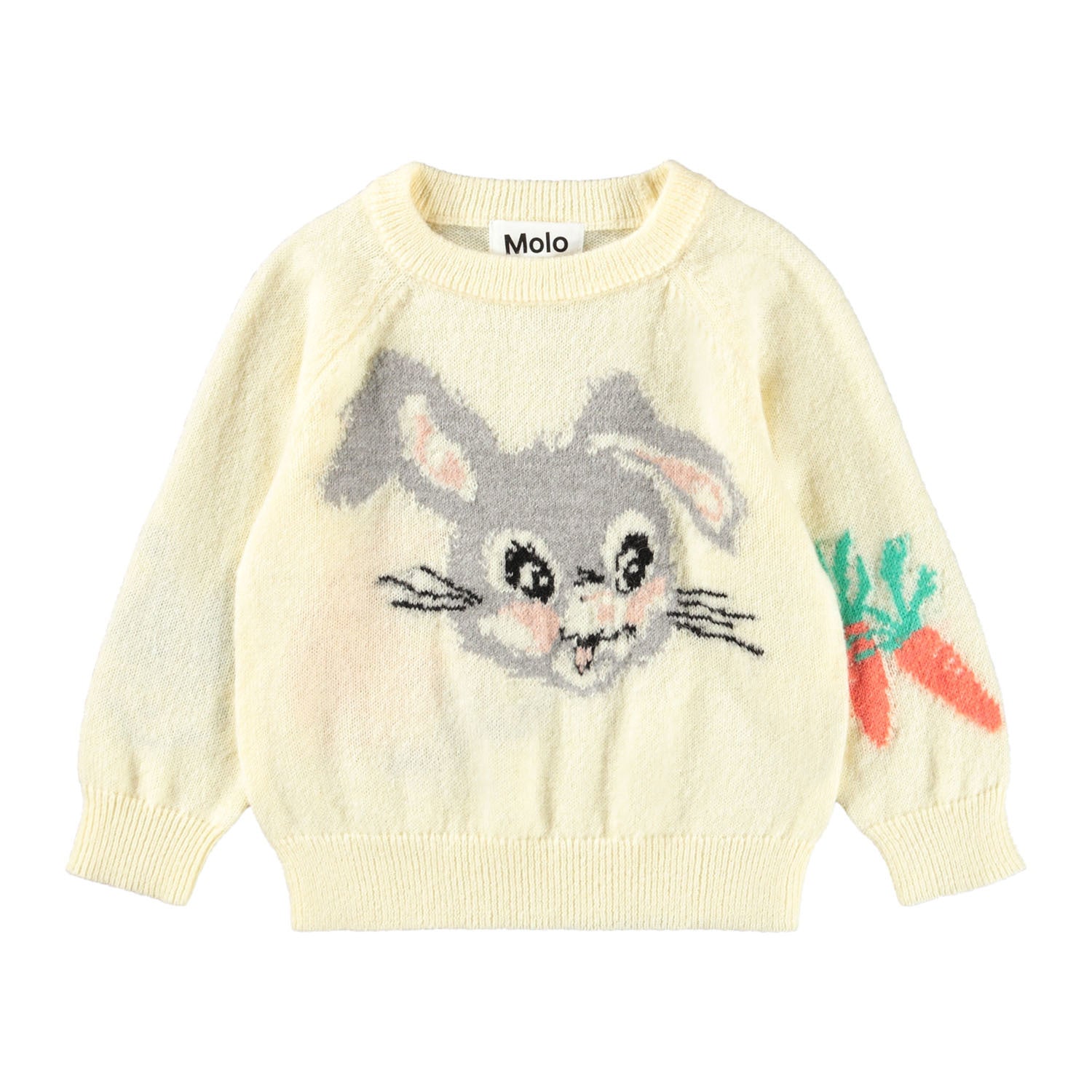 Knitted sweater for the little ones. The sweater is light yellow, with raglan sleeves and coloured motifs of animals and vegetables.