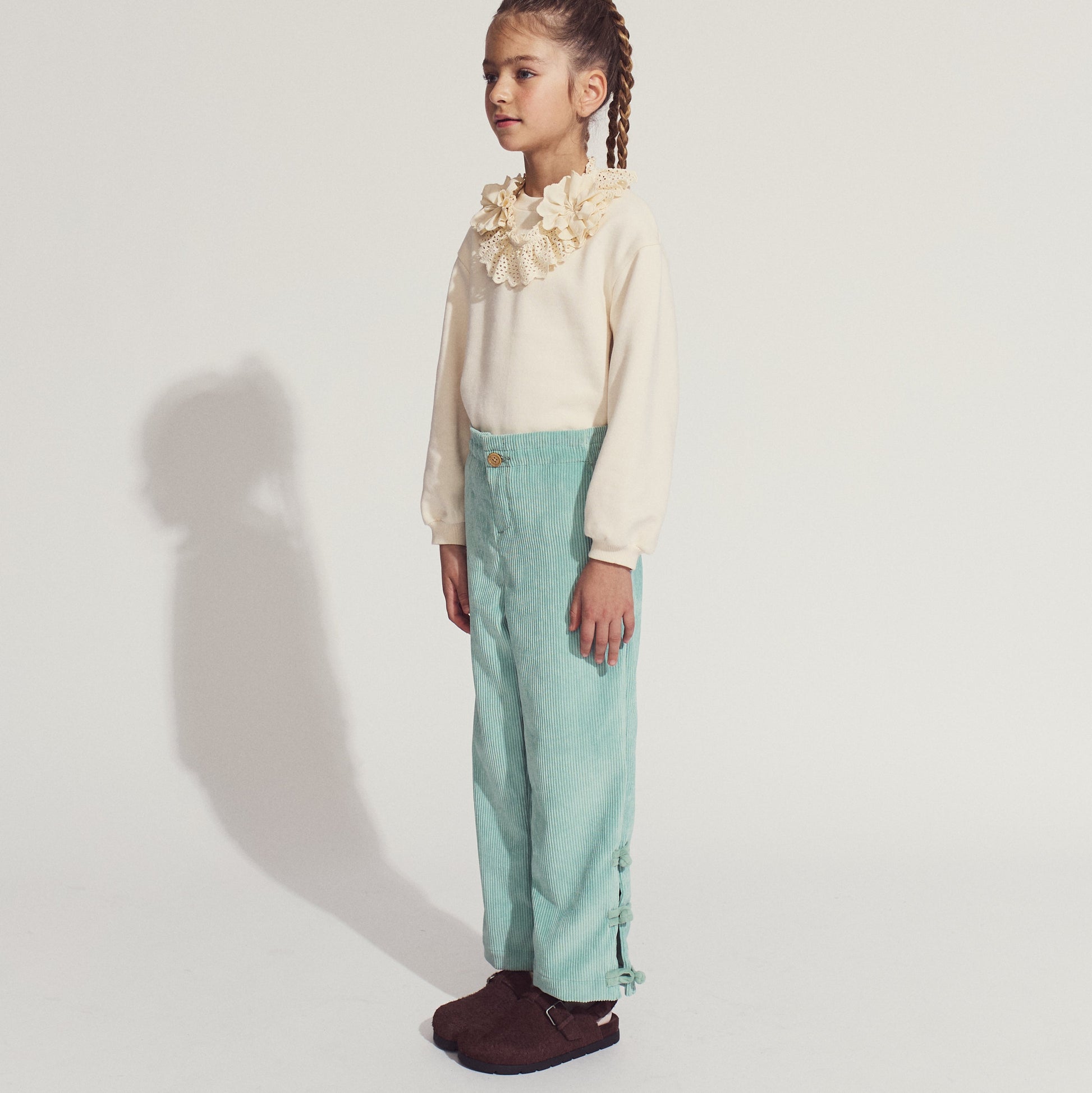 Western style meets Eastern chic with the Arielle Straight Fit Pants in seafoam green, featuring side slits and a Chinese button closure that bring together effortless charm and cultural elegance.