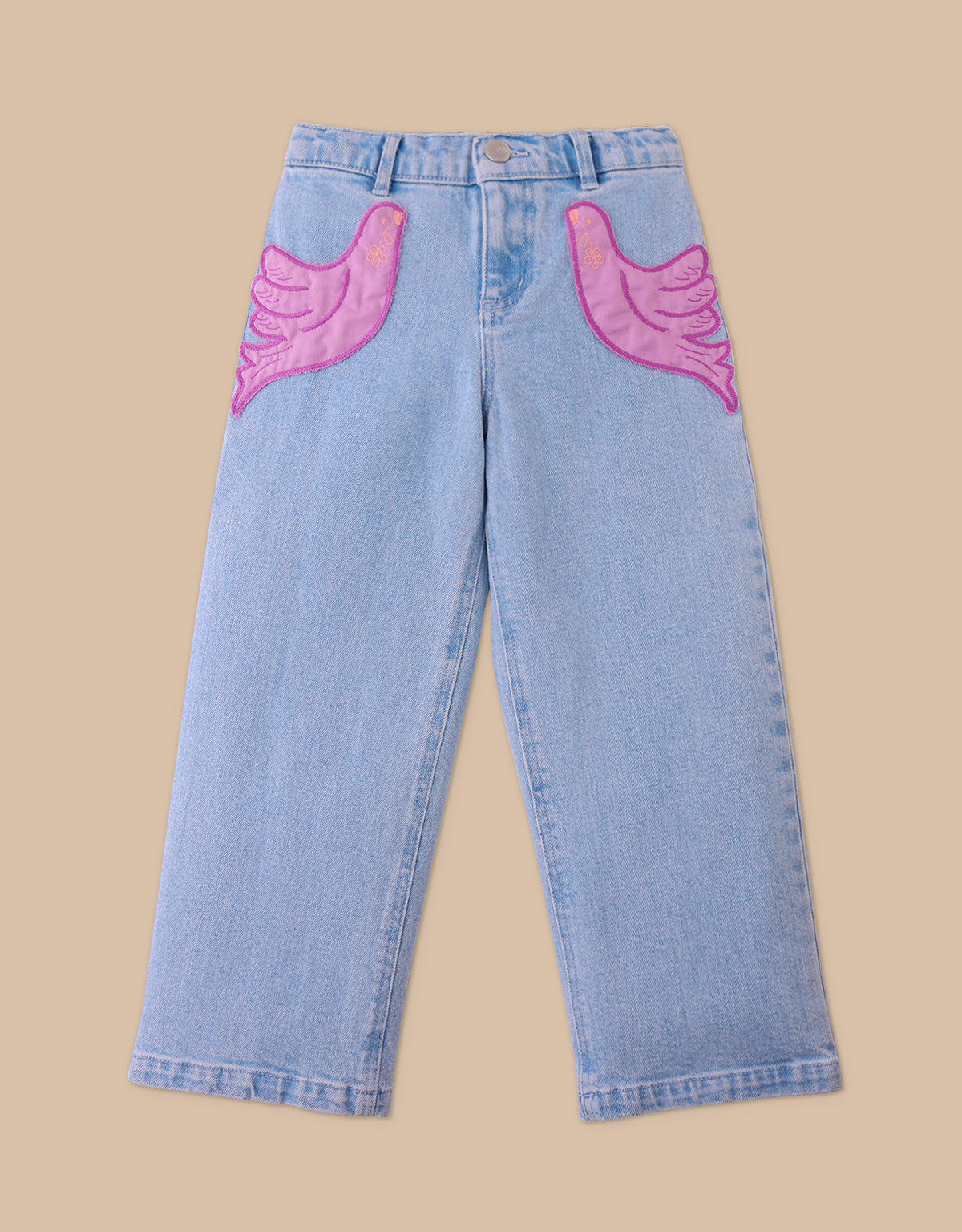 Fly high in style with our Esme denim pants featuring bird patch pockets, adding a whimsical touch of nature's beauty to her everyday.