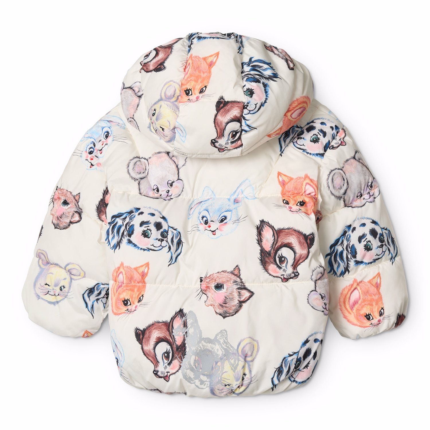 Off-white water-repellent jacket for the little ones made of recycled polyester with a print of colorful animals from old cartoons.