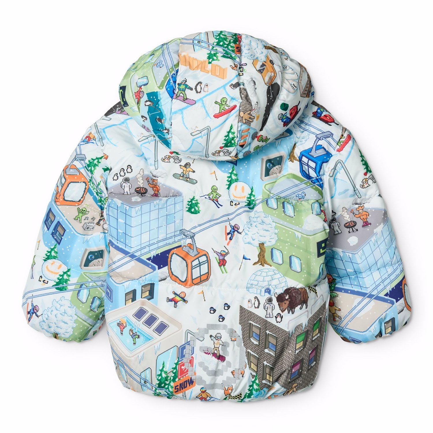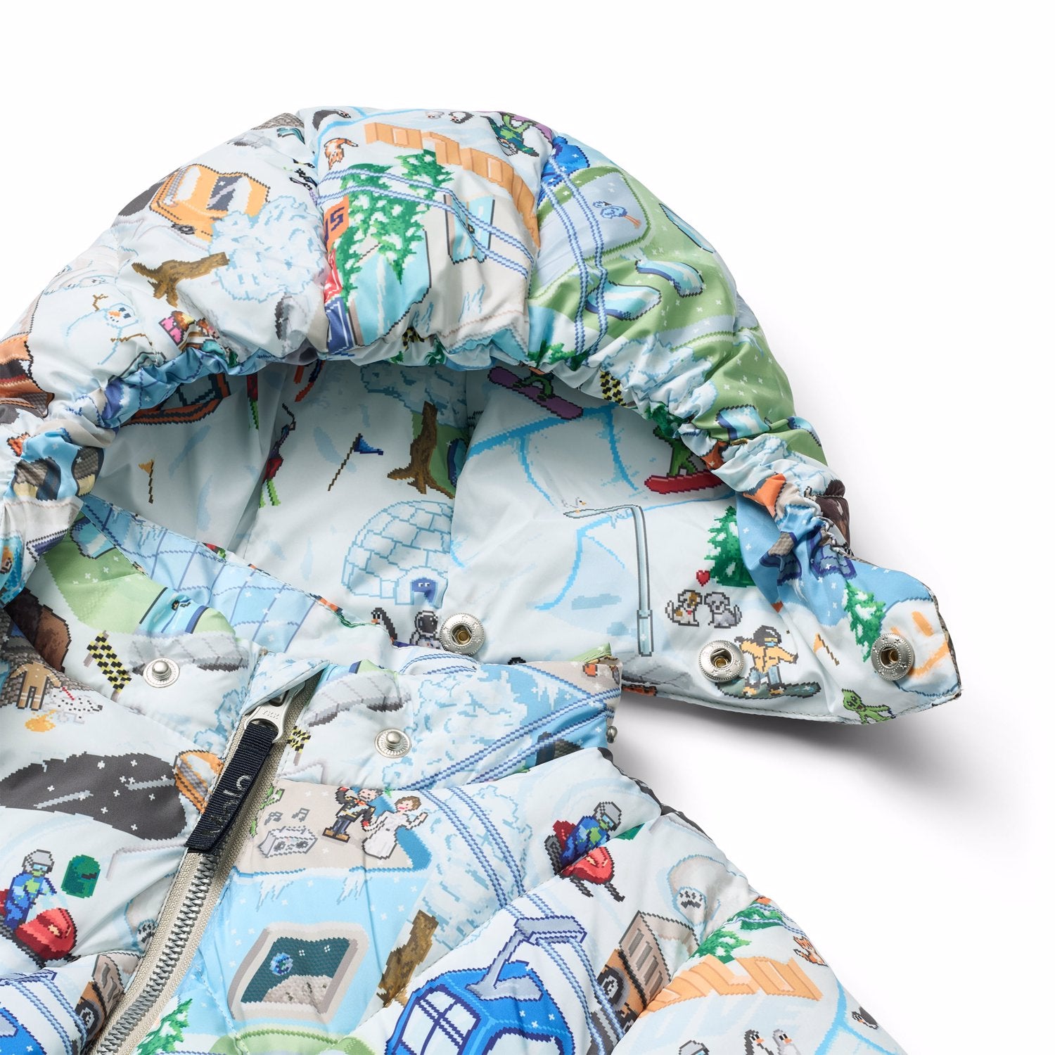 Water-repellent jacket for the little ones made of recycled polyester with a pixelated print of the real world, fun characters from Molo's collections, and a lot of exciting stories that are fun to explore in the colorful universe.