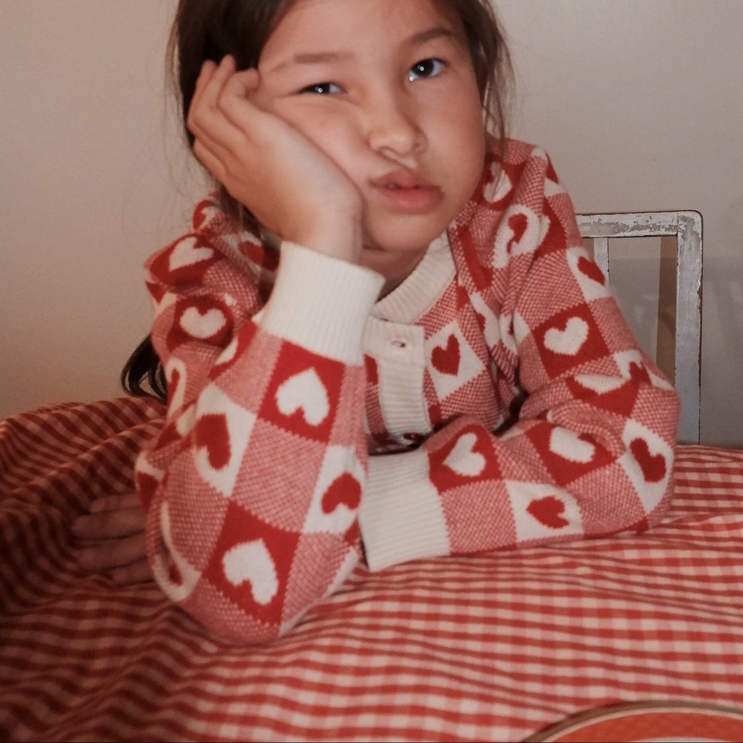 The Heart Cardigan is a cozy knit layer adorned with sweet heart motifs, adding a playful and loving touch to any outfit with its soft texture.