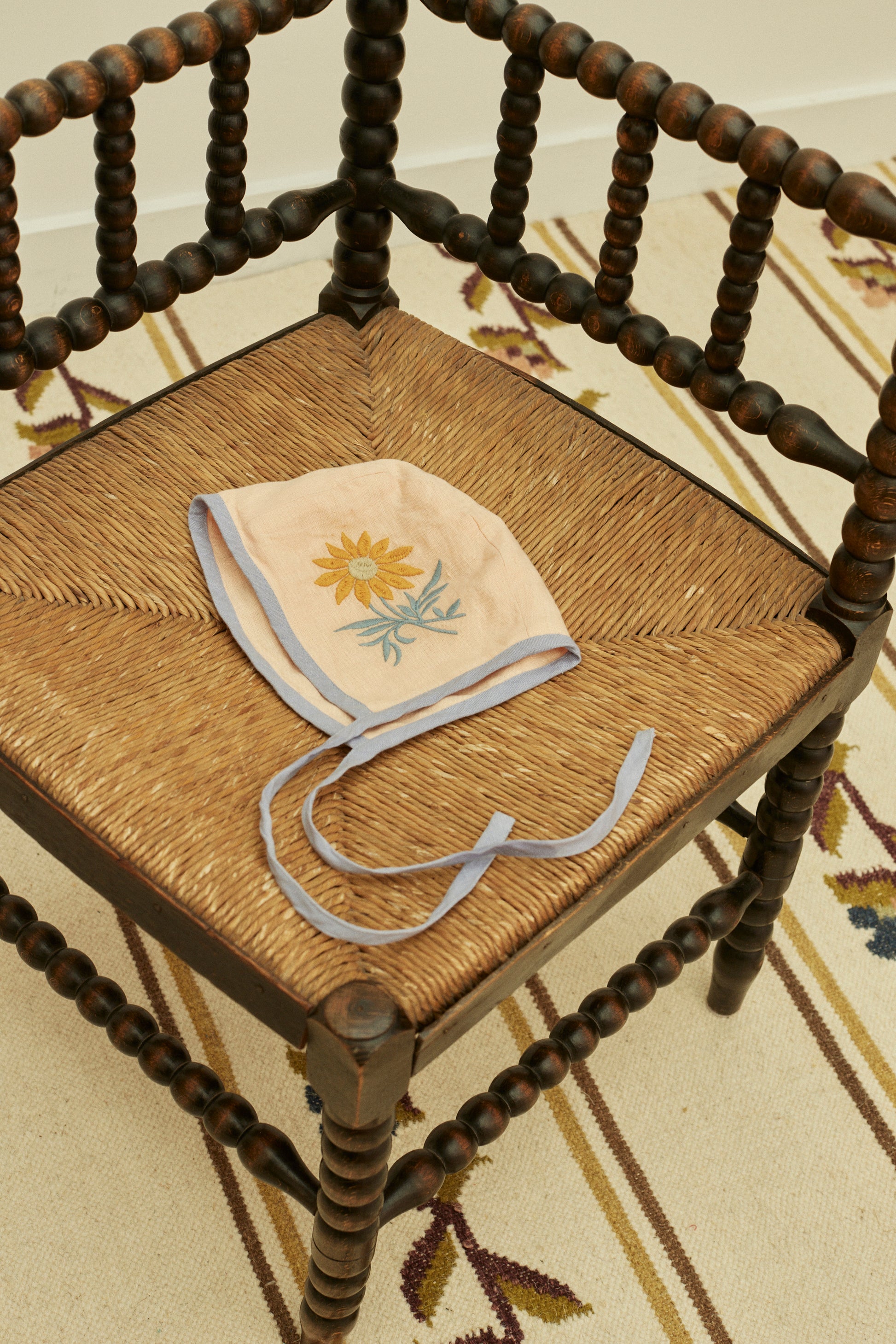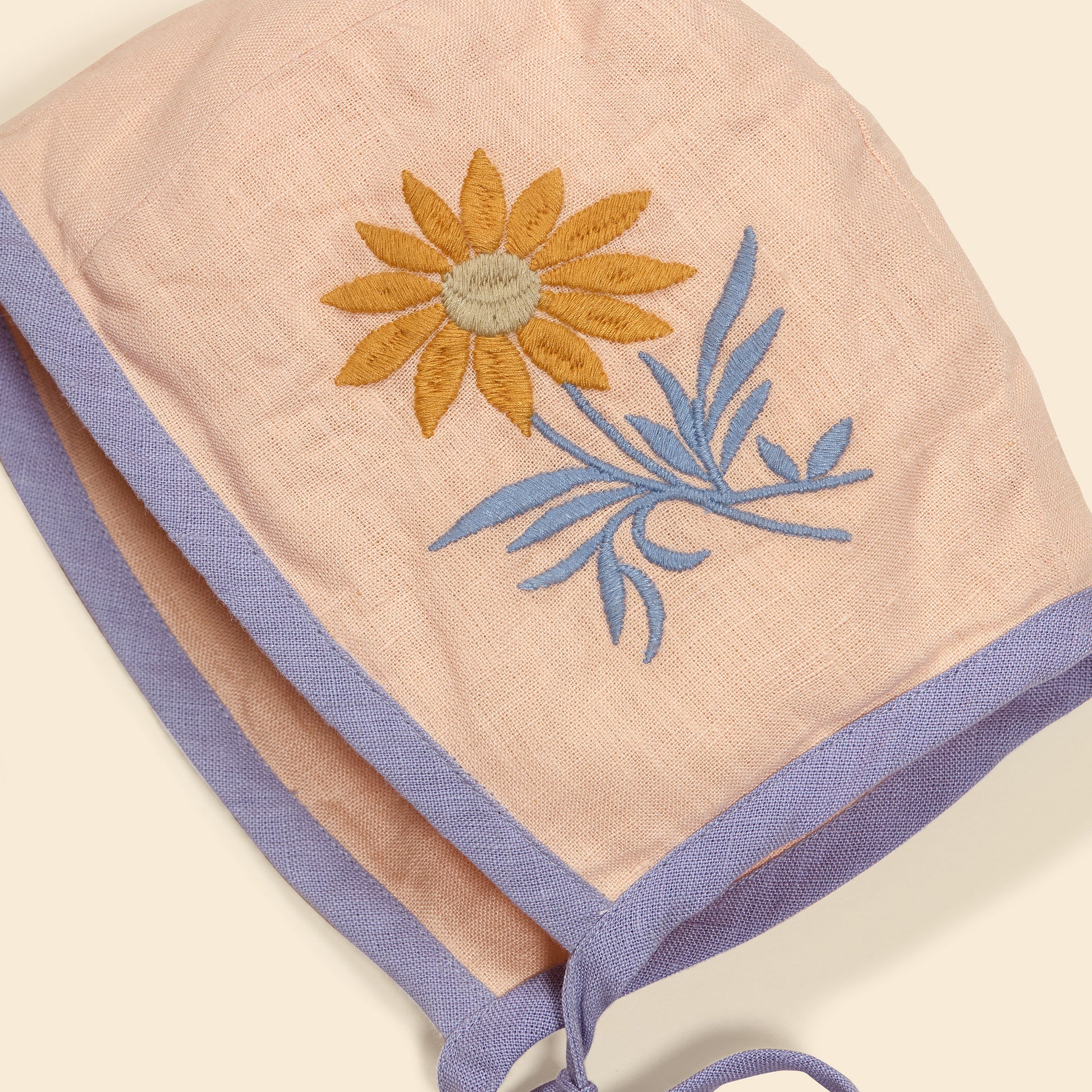 Our beloved Joni bonnet in ‘satin pink’ linen features a contrast floral motif embroidery, with contrast lilac-grey binding and ties. This sweet bonnet offers shade from the sun or shelter from cooler breezes.