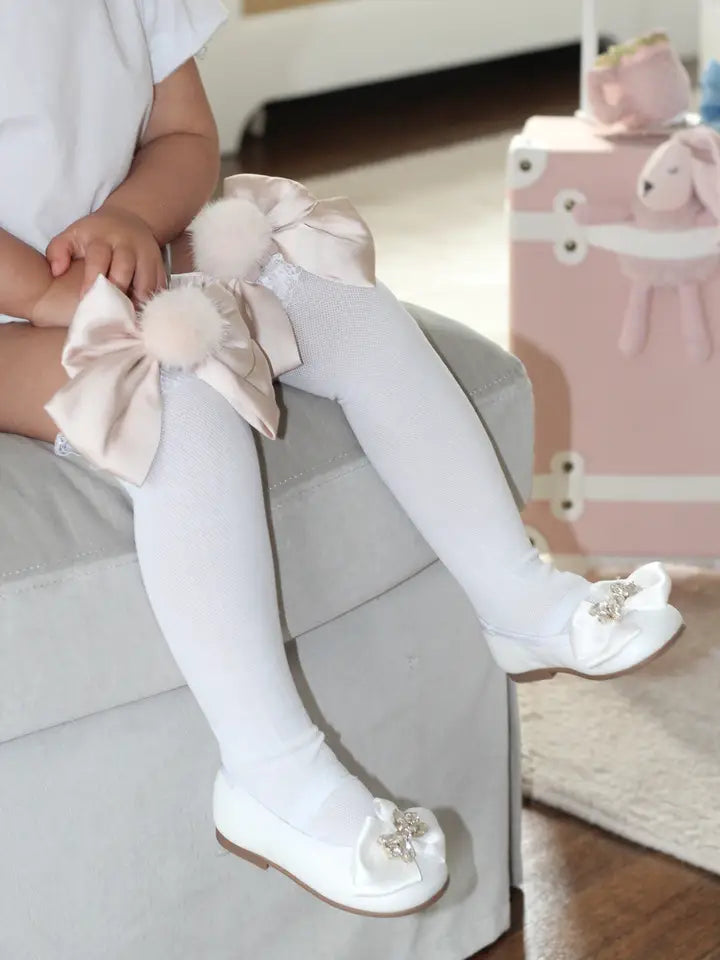 Lana Ruffle Satin Bows and Poms Socks, Champagne