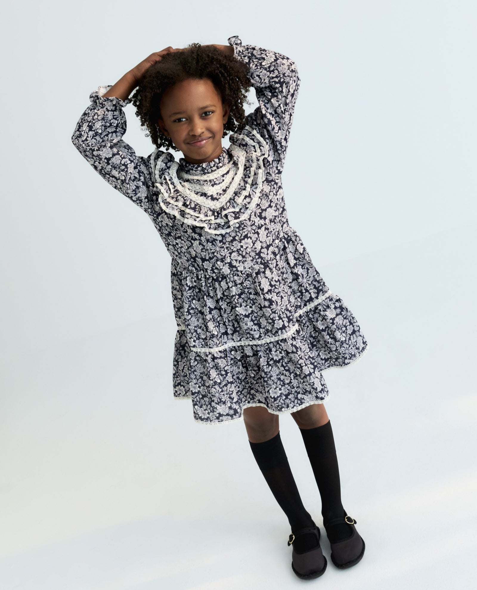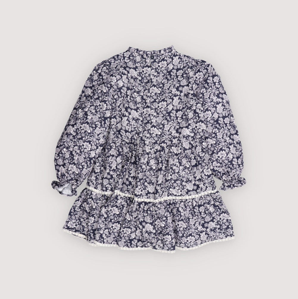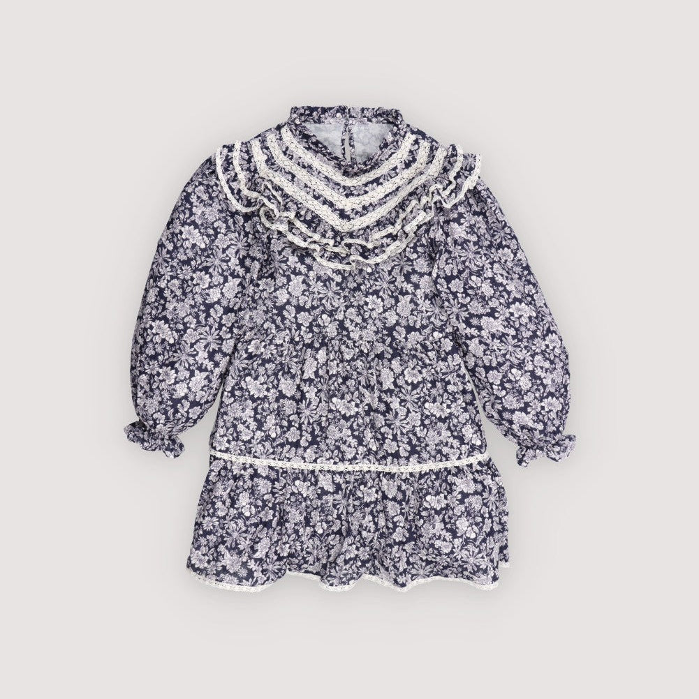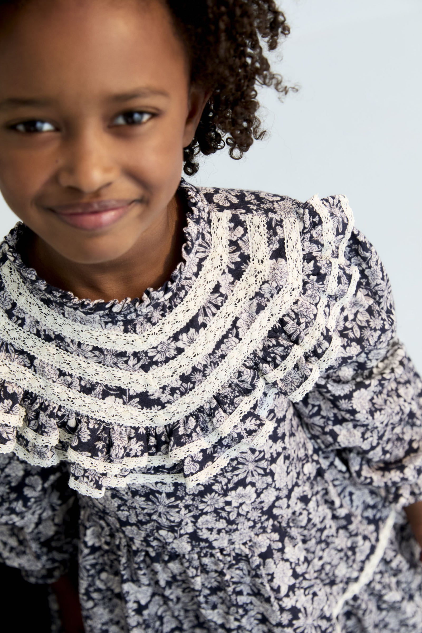 Short double gauze dress with a floral print, featuring lace and ruffle details at the front. It has a waist seam and a ruffled skirt. It features a lining.