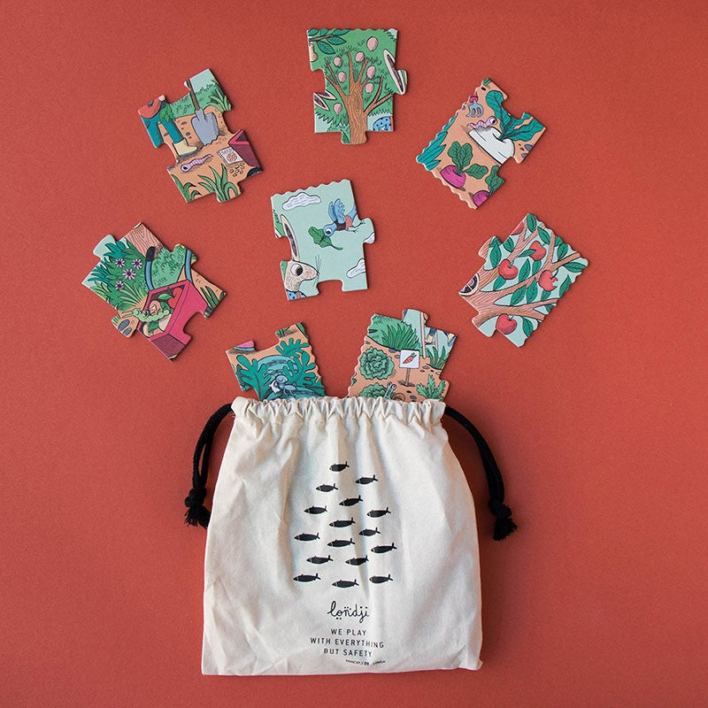 A 24-piece puzzle that is completed with an observation game. Once the puzzle is solved we have 24 pieces that we will find in the image, stimulating the discovery of the world of the garden, fruits and vegetables. Made with Recycled cardboard and paper. Packaged in sturdy cardboard box.