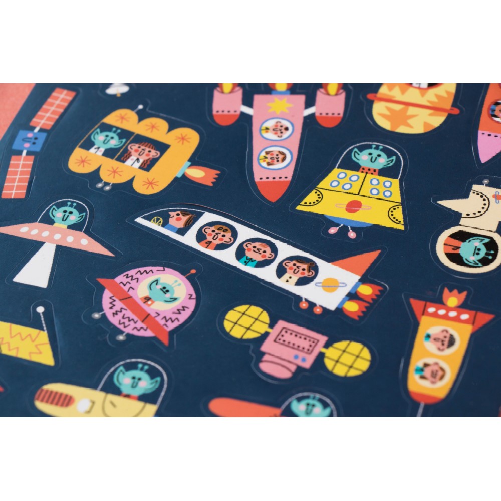 The game includes 150 space stickers that can be reattached as many times as you like. They include stickers of rockets, aliens, satellites, planets, constellations and many different stars so you can build your galaxy in your favorite setting!