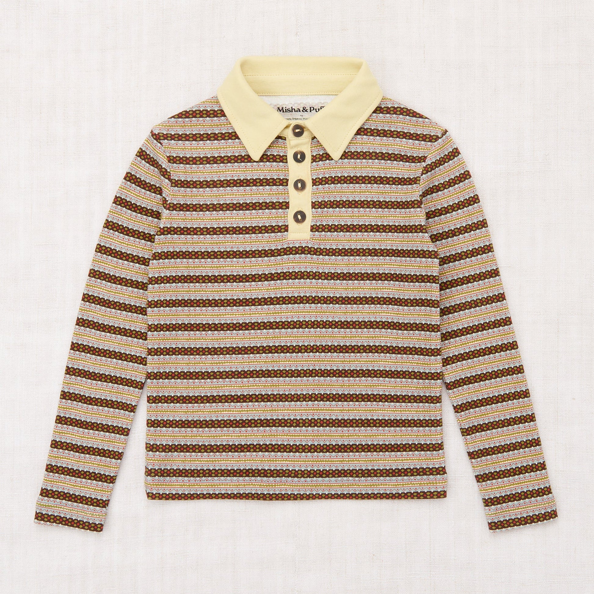 A long-sleeved polo top in organic Pima cotton, with a contrast collar and placket, and horn button closure.