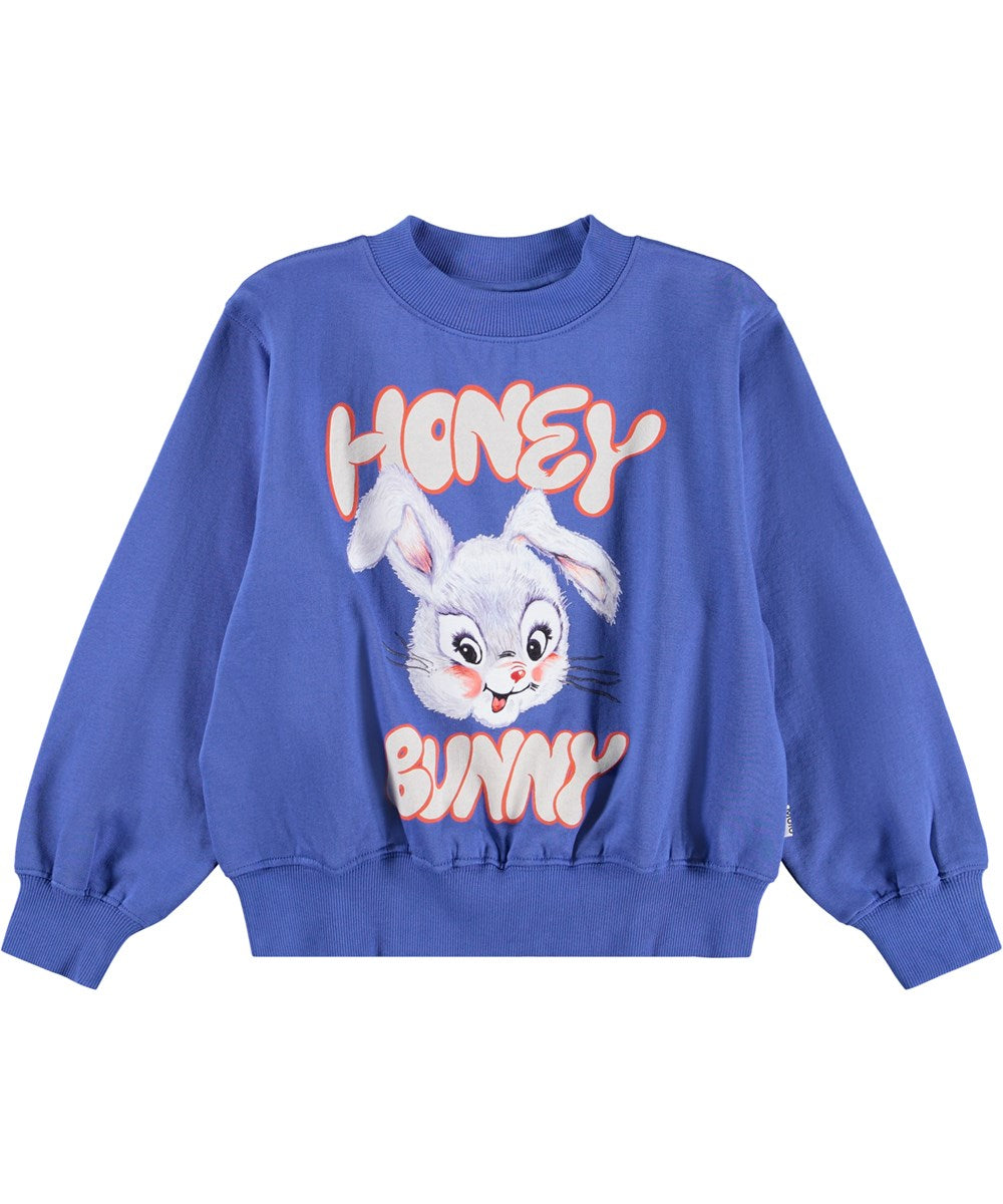 Blue sweatshirt made of organic cotton with a print of a cute drawn rabbit and the text ''Honey Bunny''.