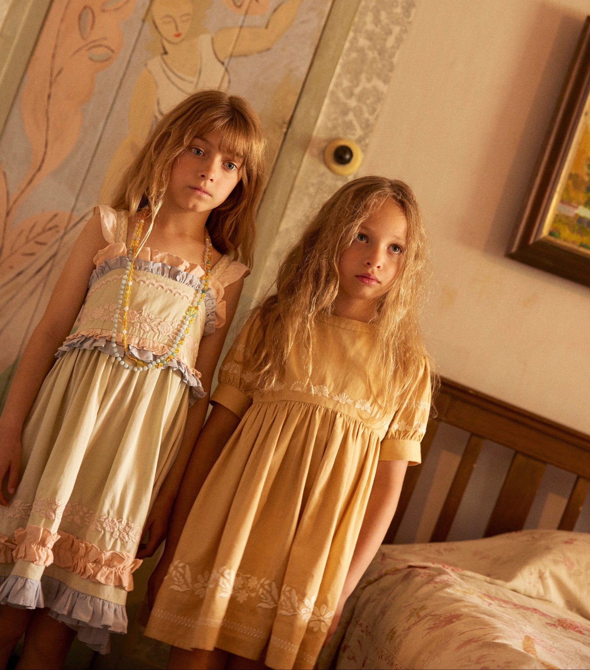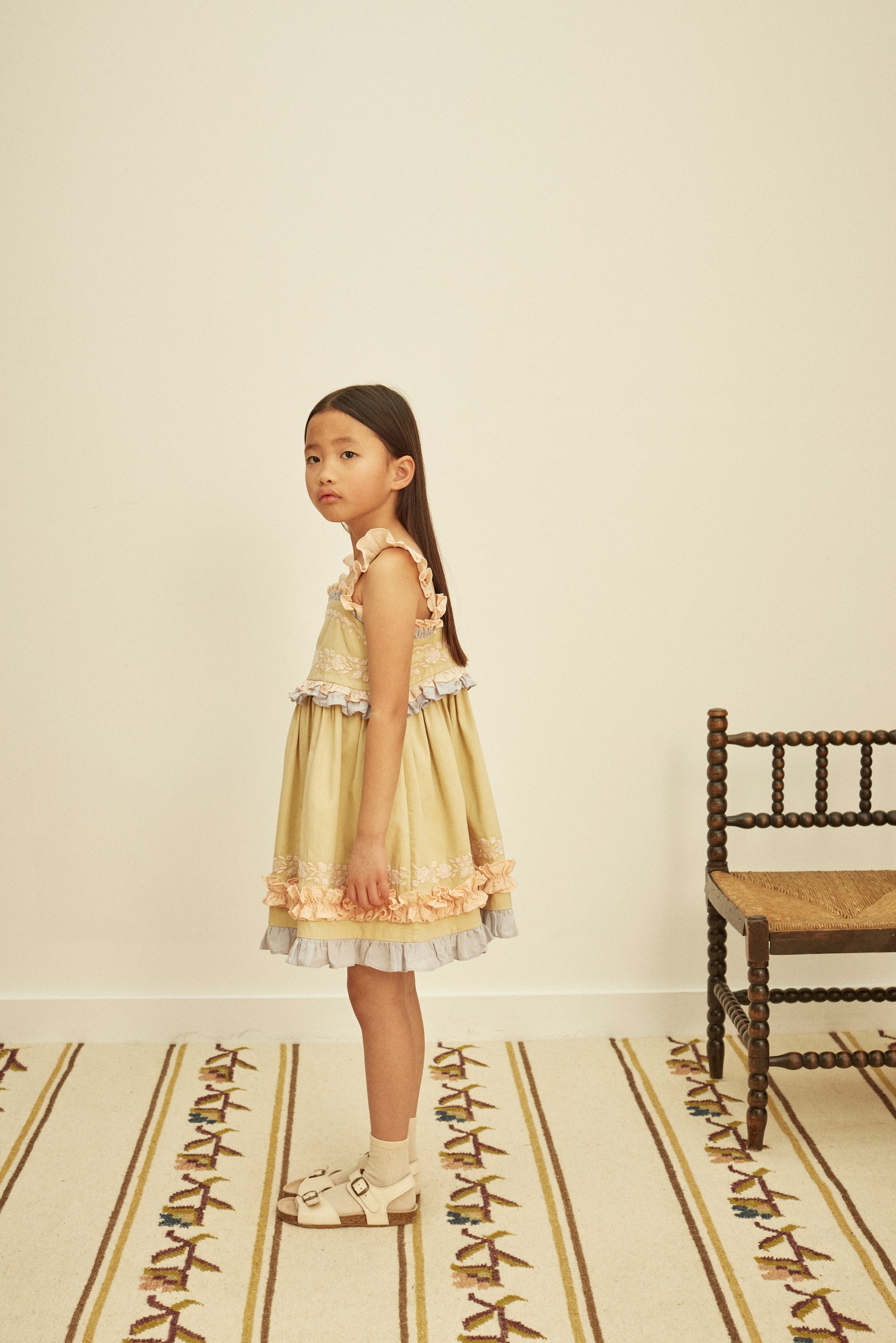 A real highlight piece of the collection, the beautiful new Lucinda dress brings a dreamy fashion mood. Crafted from our soft green ‘cloud’ structured cotton, with layers of pastel peach, rose and lavender ruffle details to chest, skirt and straps. Featuring cream embroidery around the chest, straps and hem, and a three button fastening at back. Lucinda is an extra special statement dress made for parties and summer occasions.