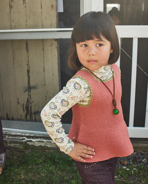 A sleeveless peplum top in a Merino wool knit, featuring a square neckline with hand-crocheted scalloped trim.