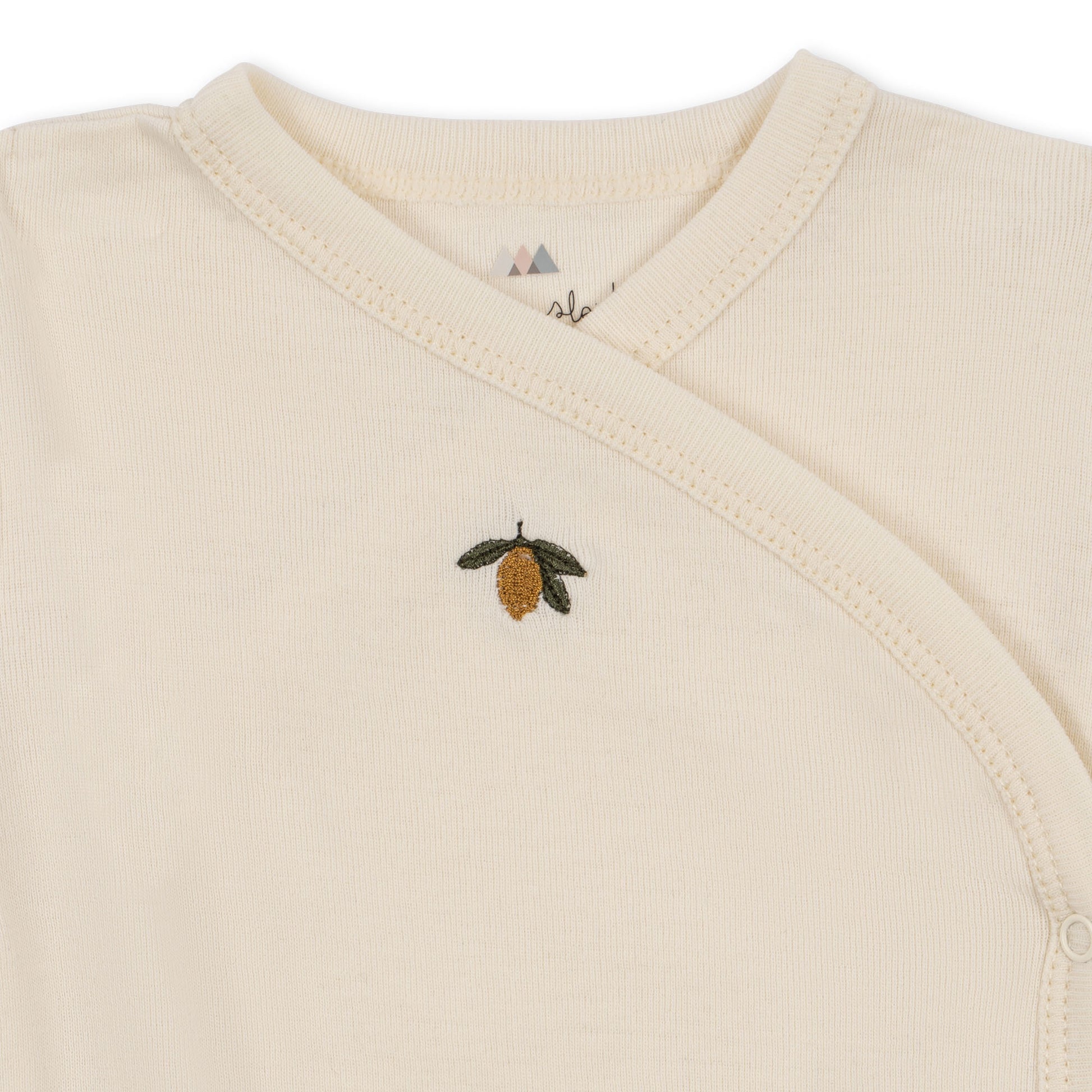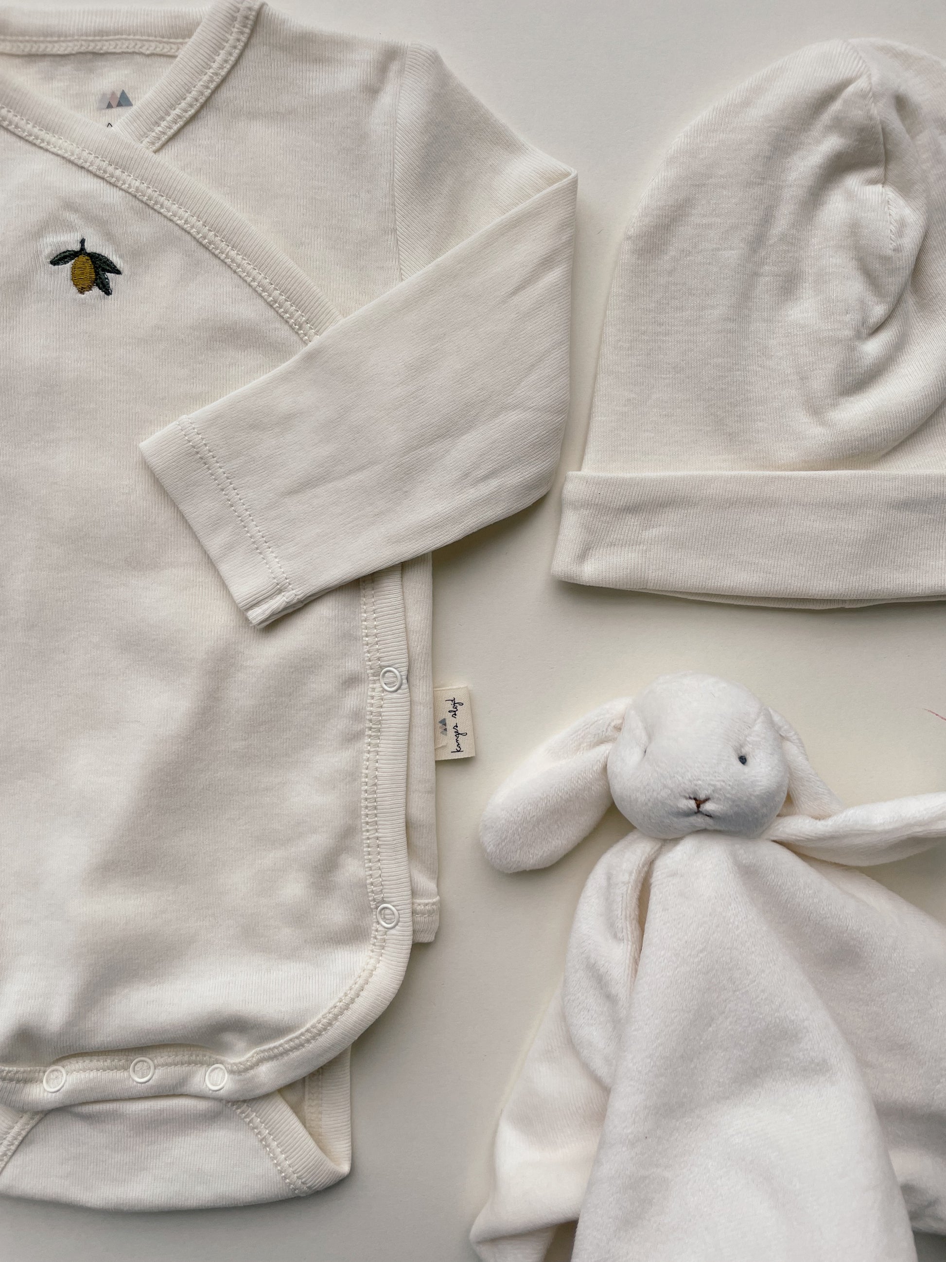 A beautiful newborn maternity set by Konges Slojd, presented in a pretty off-white gift box. The set includes a soft cuddle comforter toy, a bonnet and a bodysuit with lemon embroidery detail.