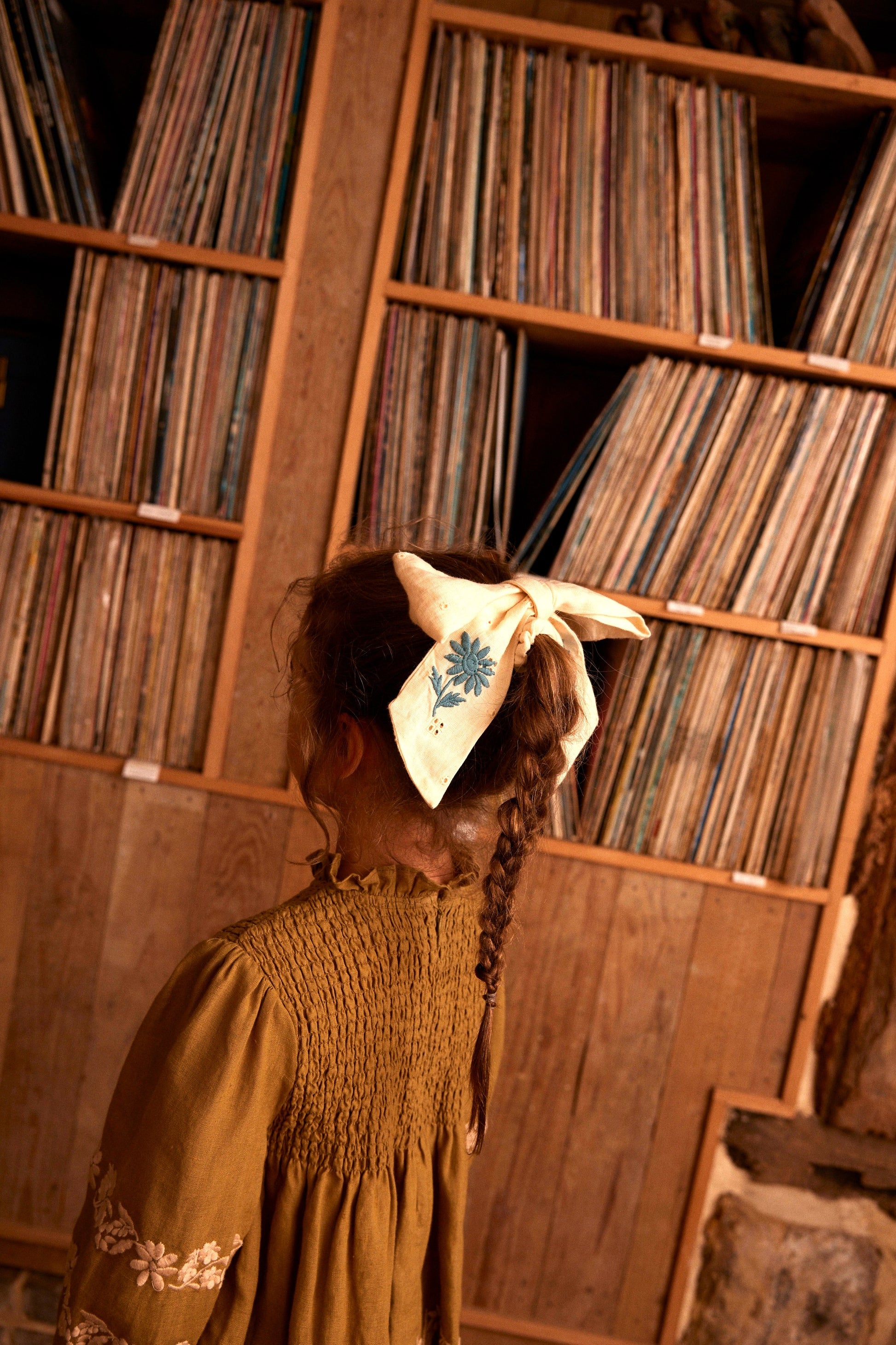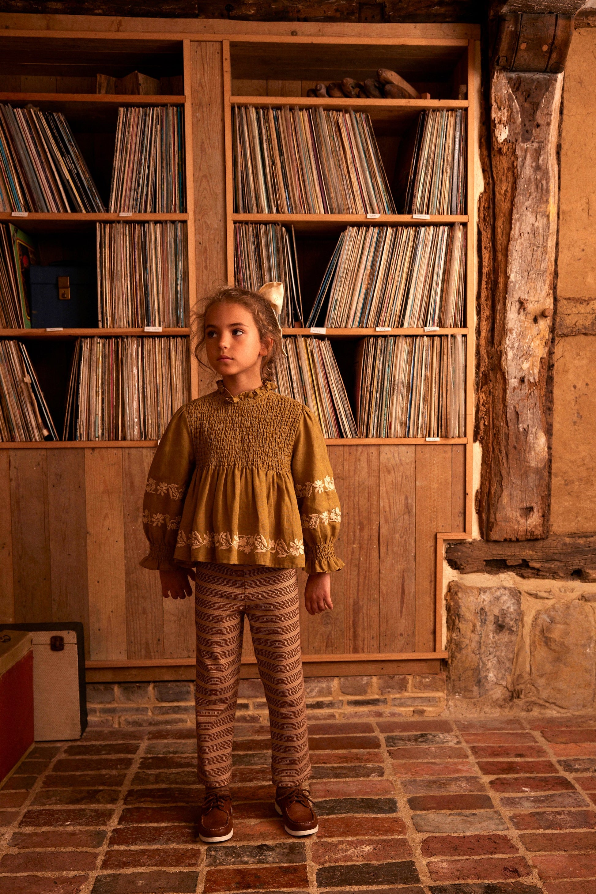 Our beloved Mia style is updated as a top in the season’s beautiful dried moss linen. Featuring elastic shirring at chest and cuffs, contrast linear embroidery circling the sleeves and hem, and a frilled neckline. Invisible zip closure at back. We love Mia layered under pinafores or paired with our trousers.