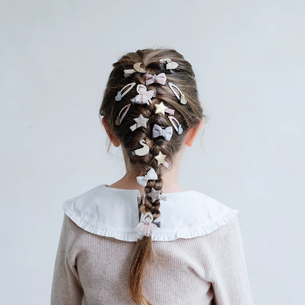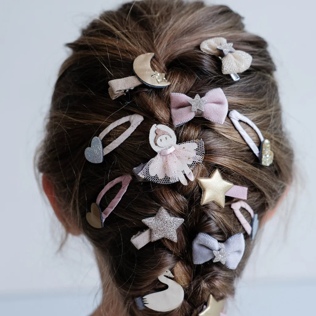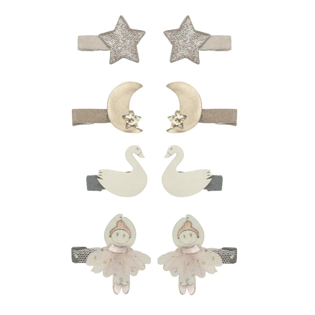 Tiny clips for your tiny dancers! Two dainty ballerinas complete with tulle tutus, two elegant swans plus moons and stars too. A perfect gift for budding ballet stars!