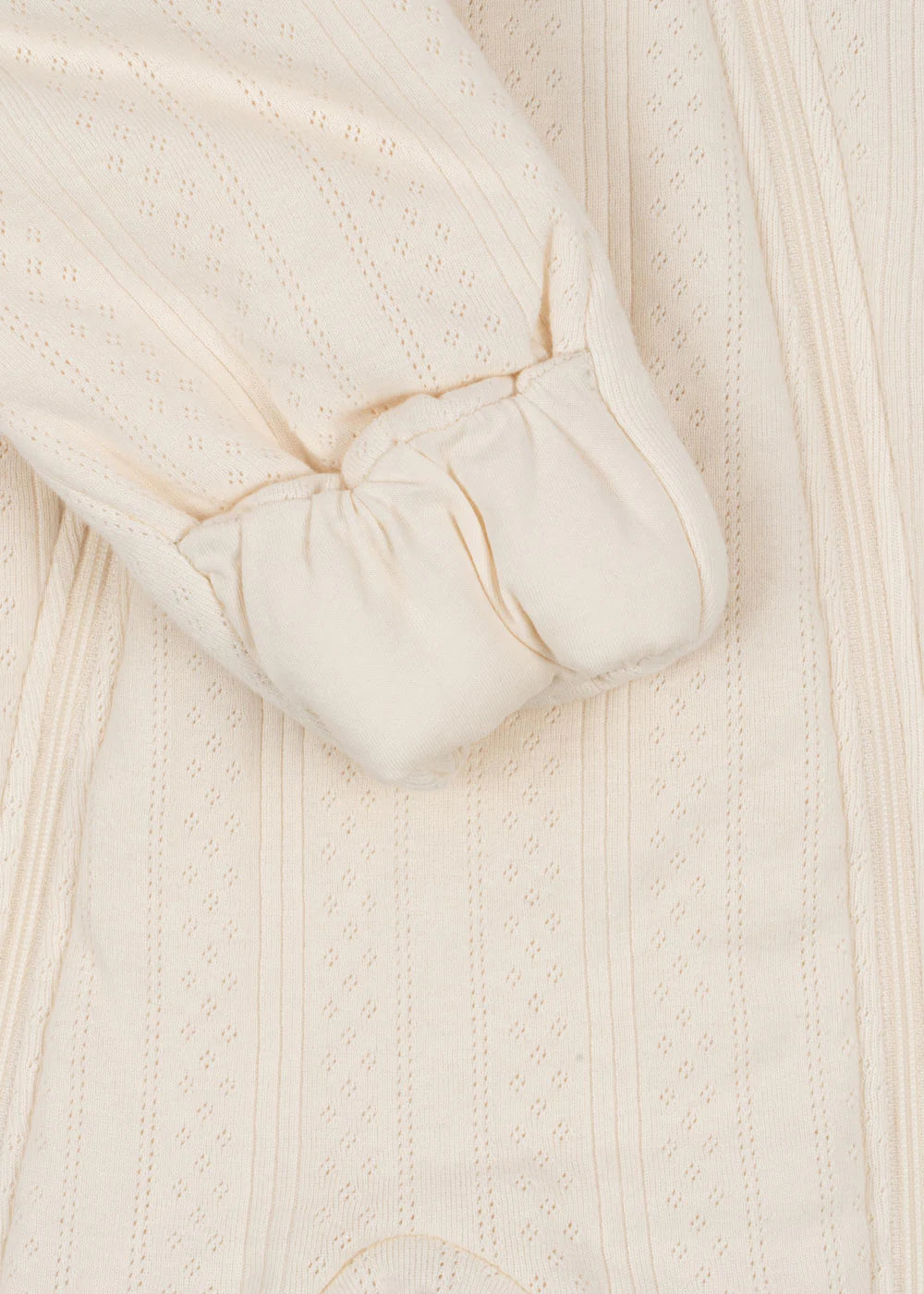 Padded onesie in decorative pointelle. Designed with a hoodie and cover for the feet.