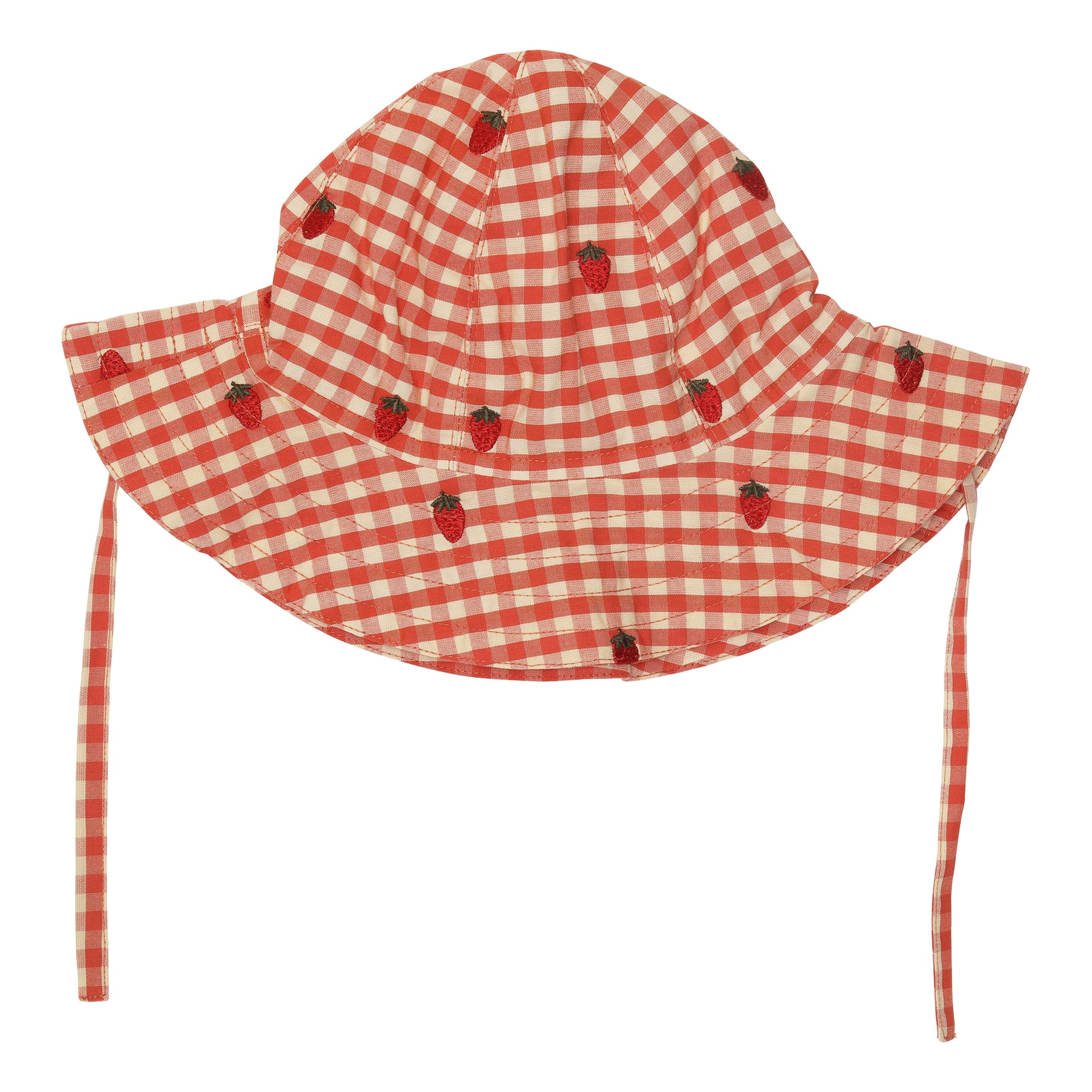 Molly Sun hat in gingham with strawberry embroidery. Has a round head shape, with strings that ensure it stays in place. Features wide brim, which blocks the sun.
