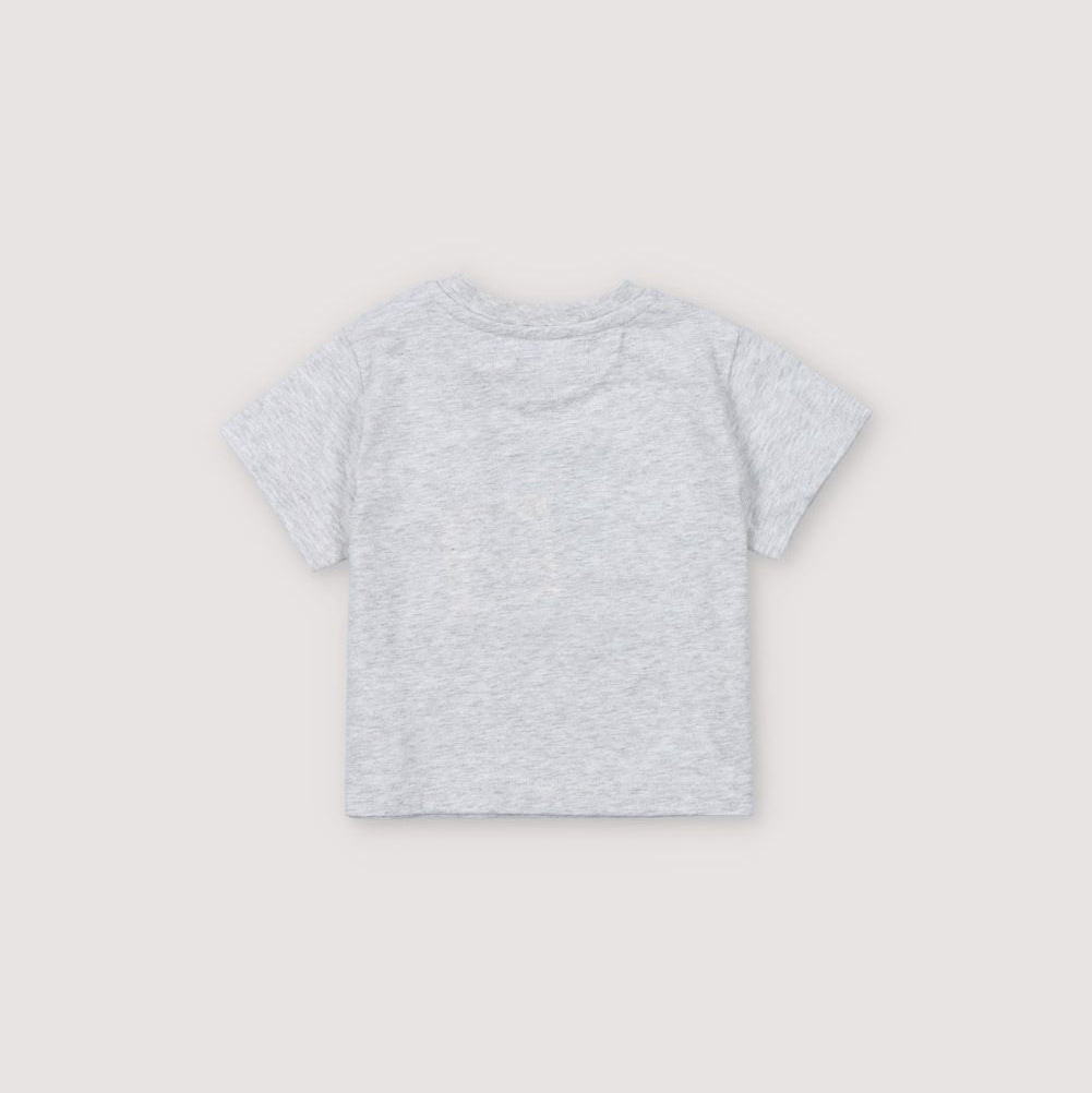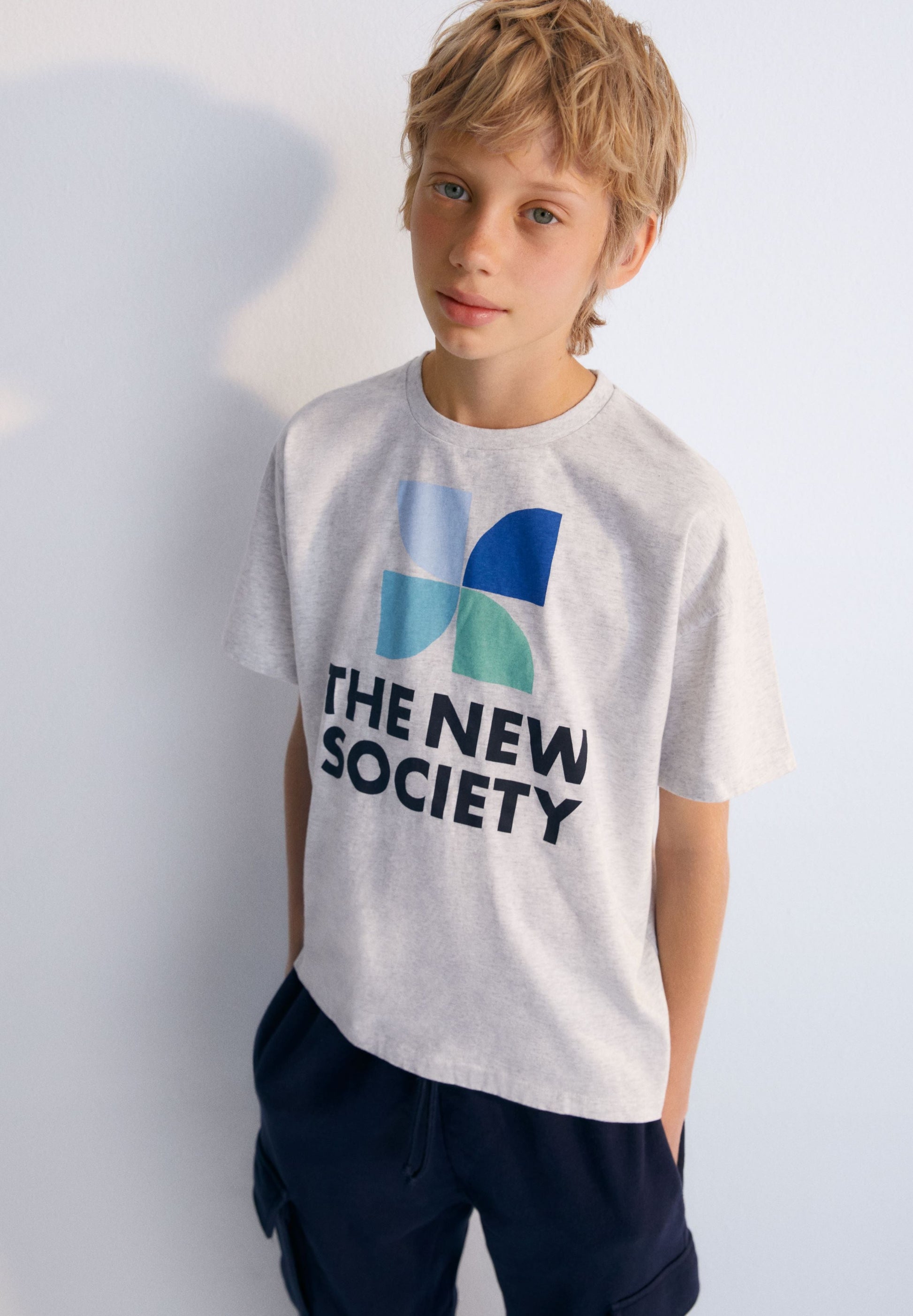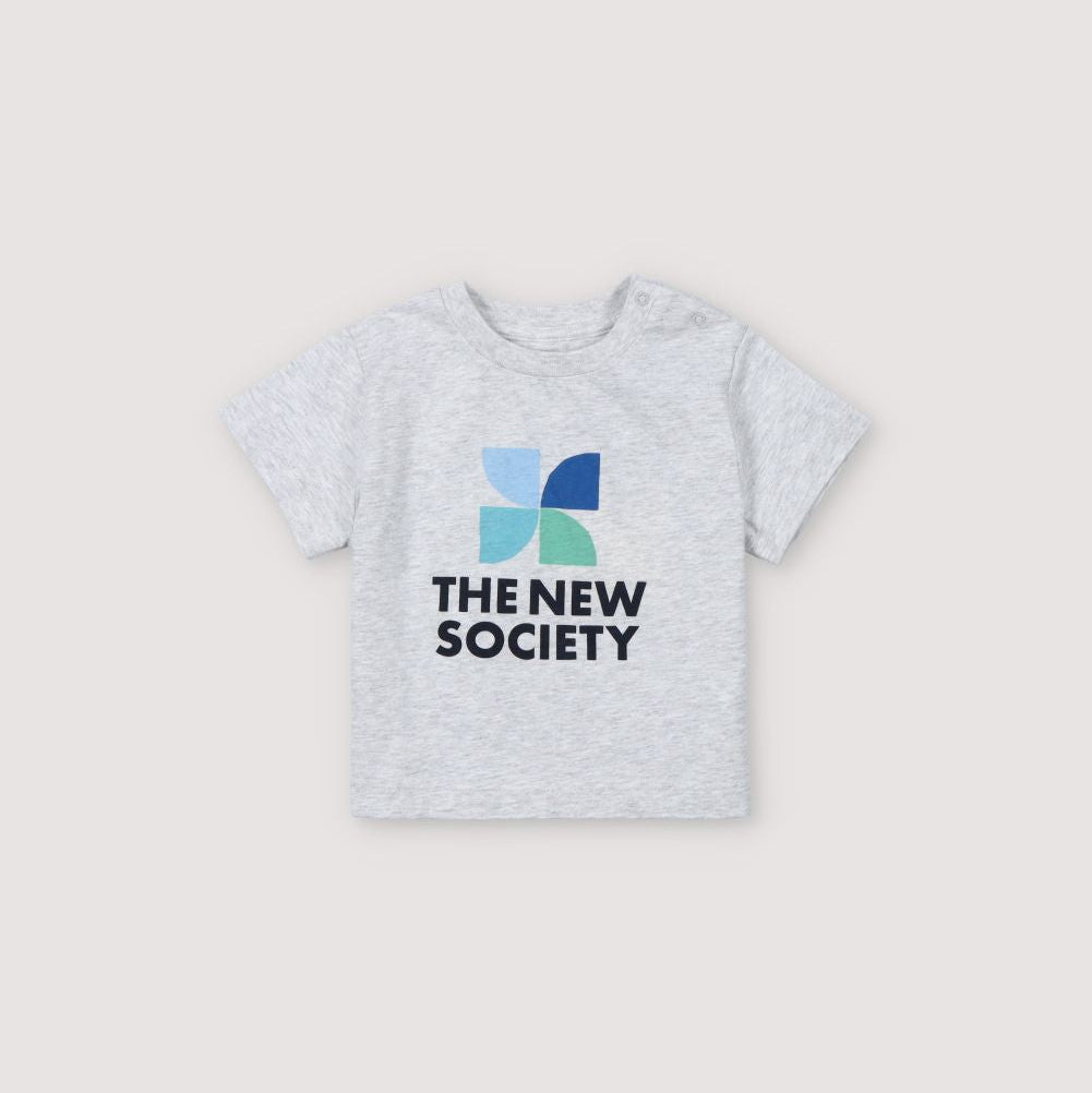 Short-sleeved, drop-shoulder T-shirt with colorful logo on the front.
