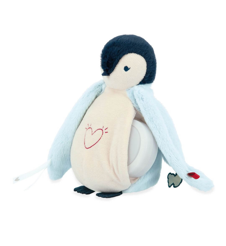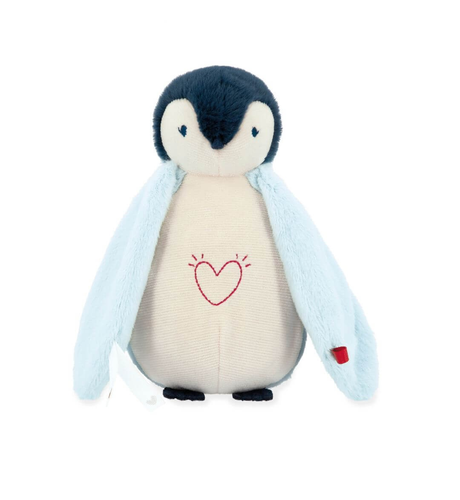 The Kaloo Nightlight Plush Penguin Blue is a wellness comfort toy in 20 cm size, designed to support restful bedtime from birth. A gentle press on its belly turns on a soft light that stays on for 20 minutes before automatically turning off. Its light unit is removable, USB‑rechargeable in 4 hours, and provides up to 11 hours of autonomy.