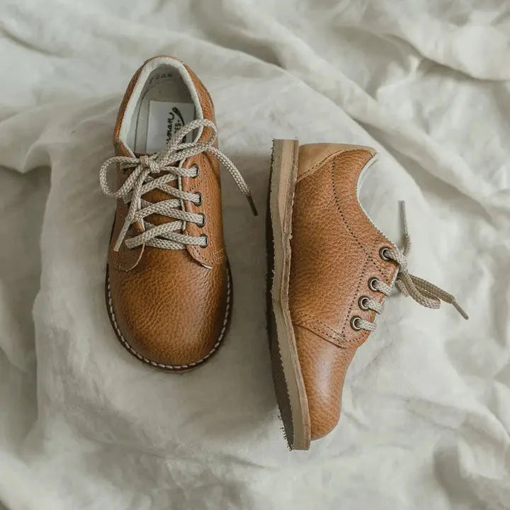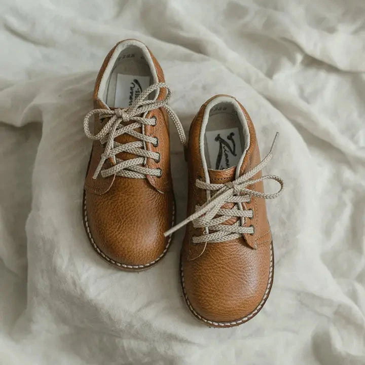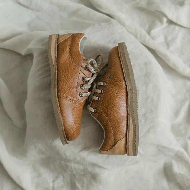 The Oliver Oxford in Tan/Cognac is made of a genuine Italian leather and lined in breathable leather which wicks away moisture. The structure of the shoe and the flexible rubber sole provide stability without weight to support your little one's early steps.