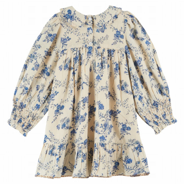 Smocked, ruffled cotton flannel dress adorned with blue flowers on an ecru background.