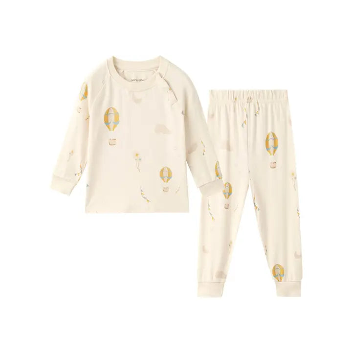 Pajama sets come with ultra-soft organic cotton, with a long-sleeve top and bottom. Two snap buttons at the front for easy pulling on. Featuring a neutral maple pattern print. The essential comfy and healthy apparel for kids to wear at home.