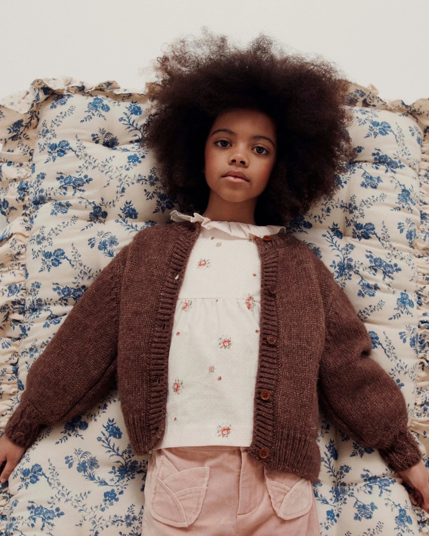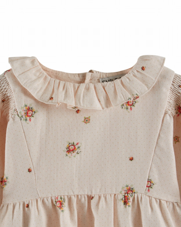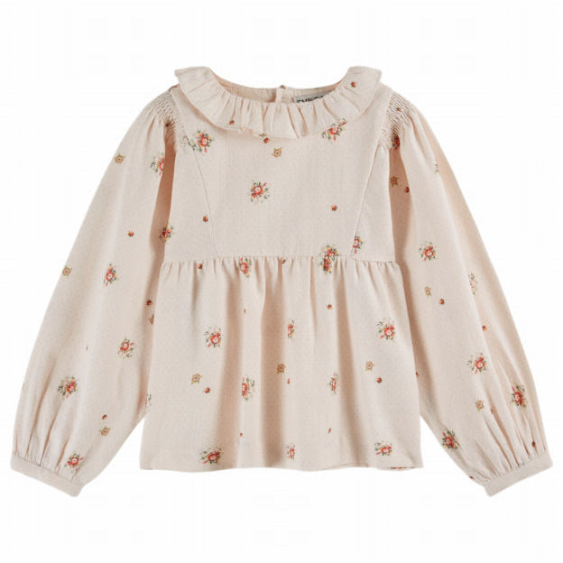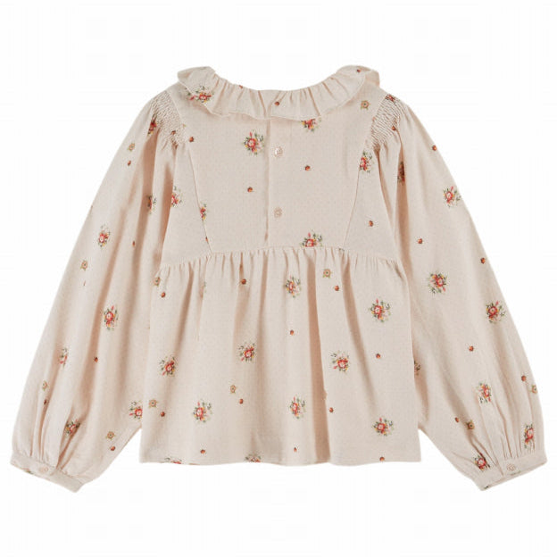 Soft cotton flannel blouse, printed with grains of multicolored bouquets of flowers on a pale pink background.