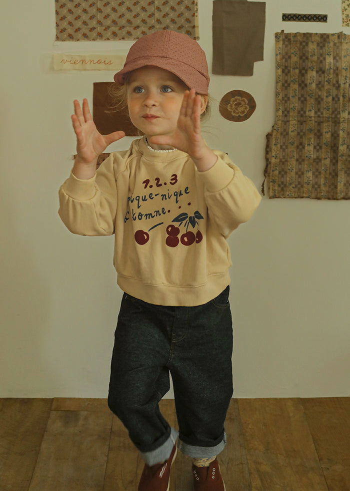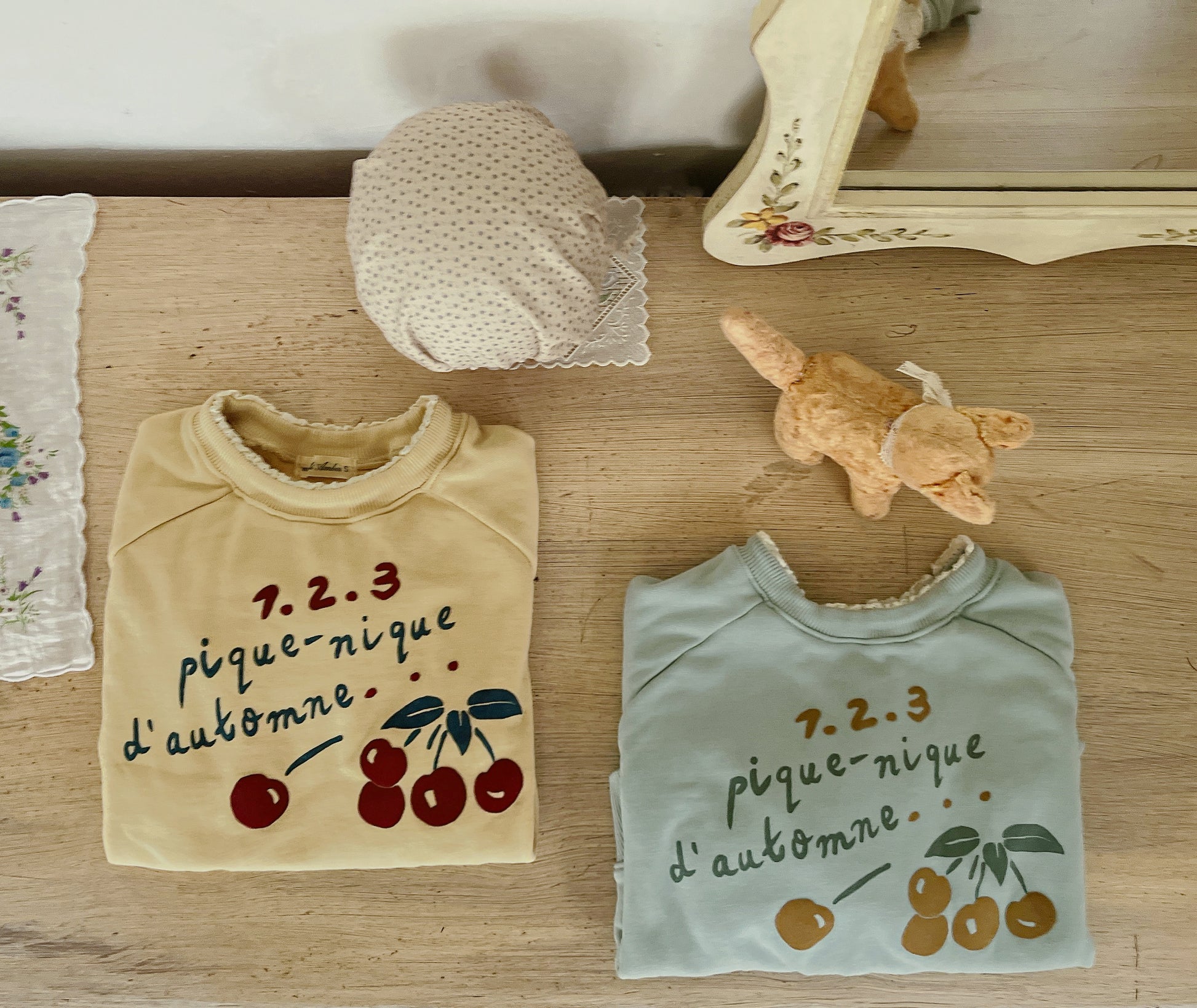 Soft cotton terry sweatshirt with a touch of lace detailing on the neckline and sweetest cherry print in velvet finish. Ribbed neck and cuffs with stretch.