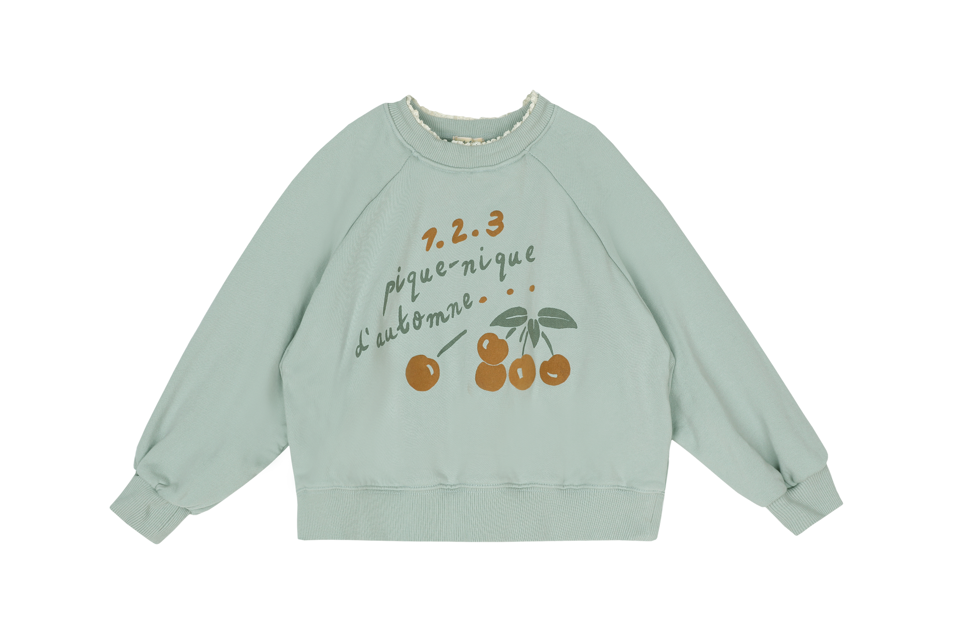 Soft cotton terry sweatshirt with a touch of lace detailing on the neckline and sweetest cherry print in velvet finish. Ribbed neck and cuffs with stretch.