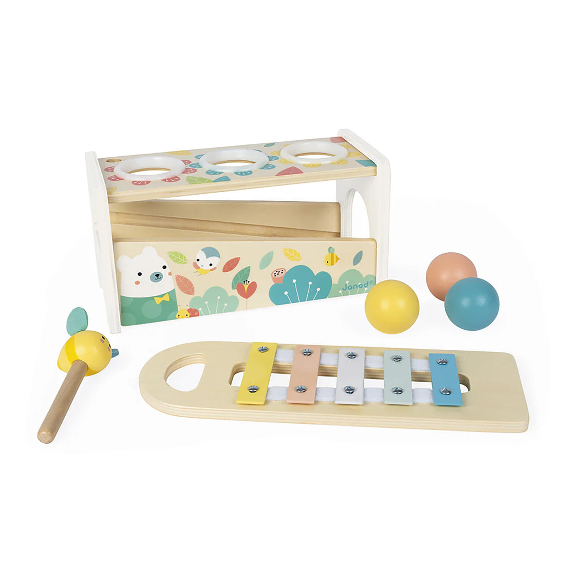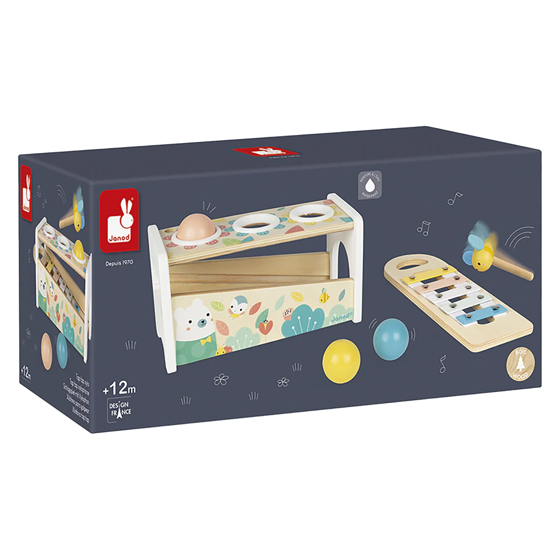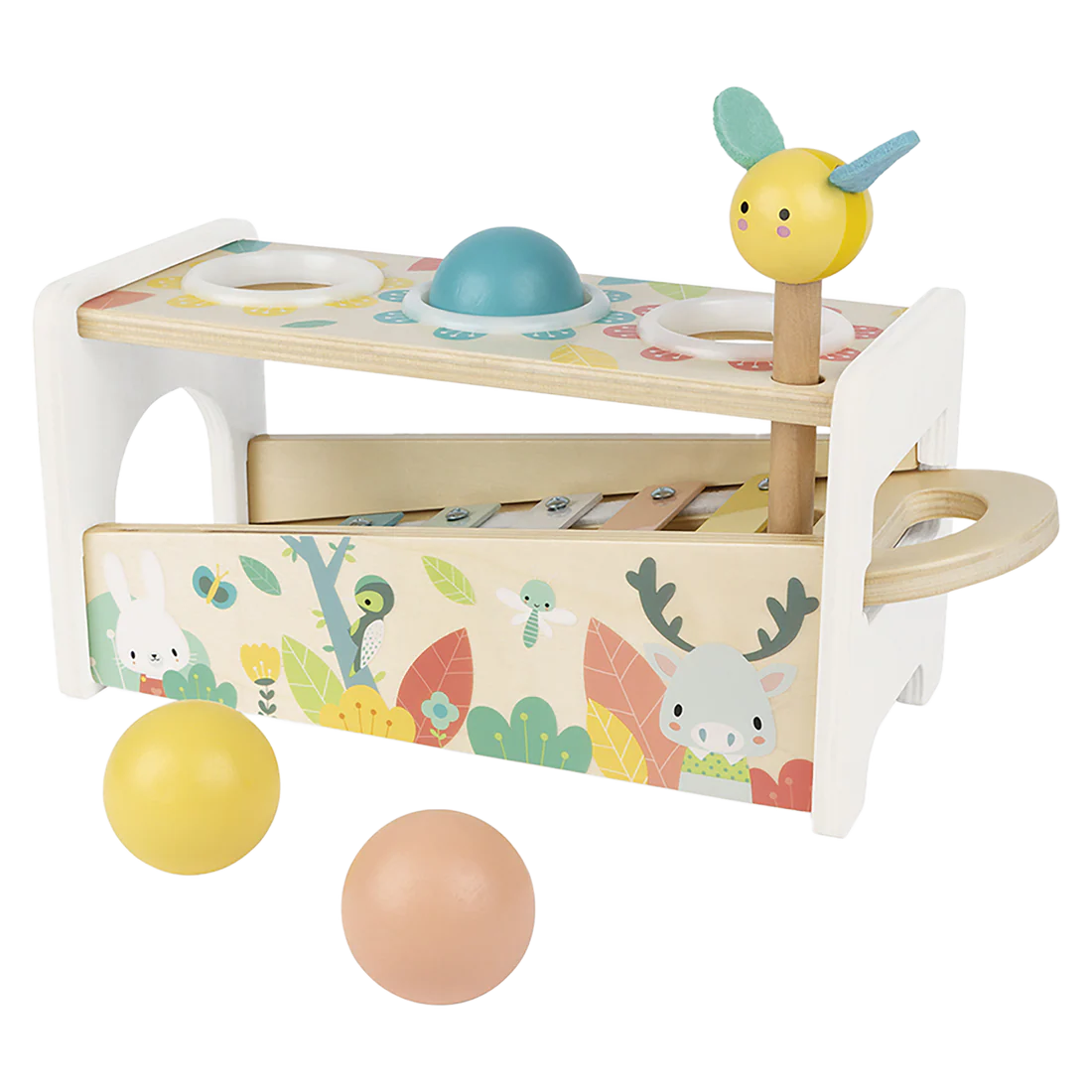 The Pure Tap Tap xylo is a 2 in 1 game: a bee hammer to hit the 3 balls that fall while tinkling the keys of the xylophone, which is also removable to be able to play everywhere!