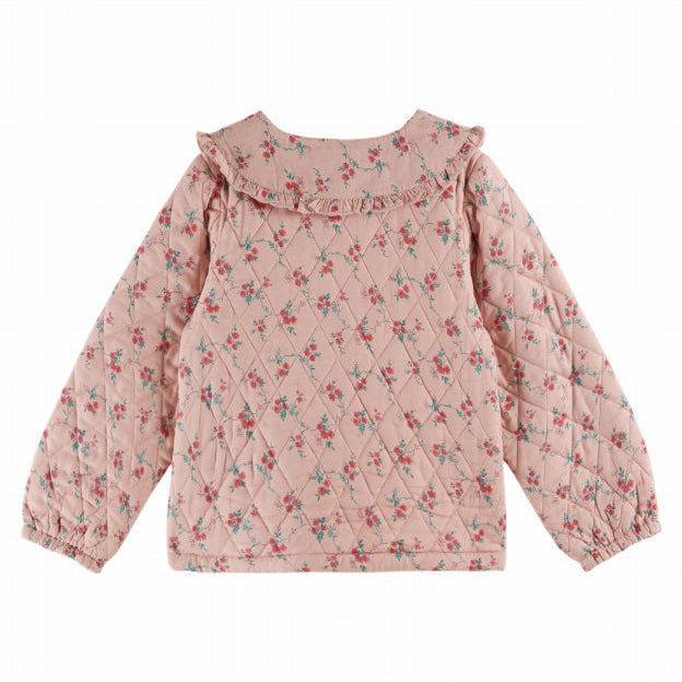 Quilted cotton jacket decorated with red flowers on a pink background.