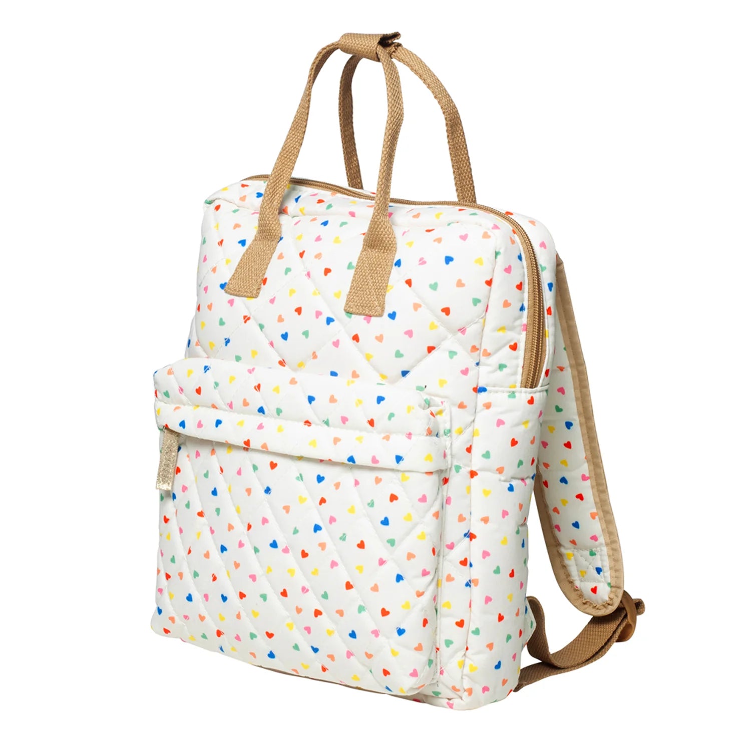 This fun quilted rucksack is made from our rainbow hearts fabric and is the perfect size to carry day to day essentials! Fully lined with pink stripe fabric, it features a zip front pocket, a carry handle and adjustable back straps.