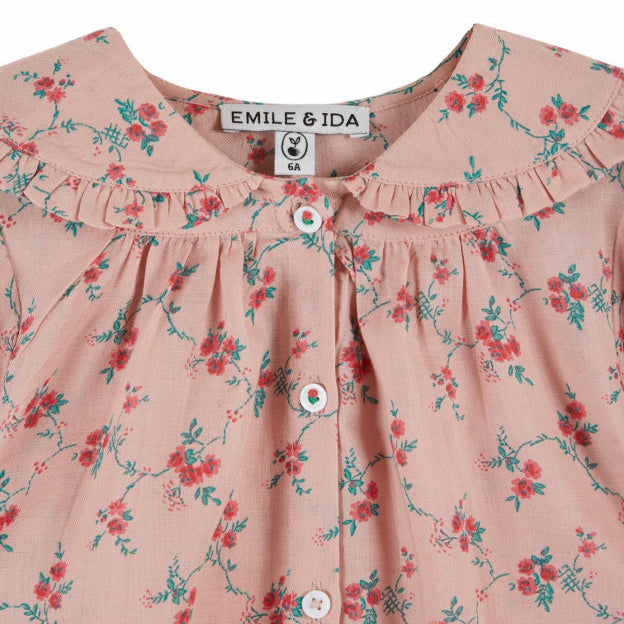 Cotton blouse adorned with floral bouquets on a pink background.
