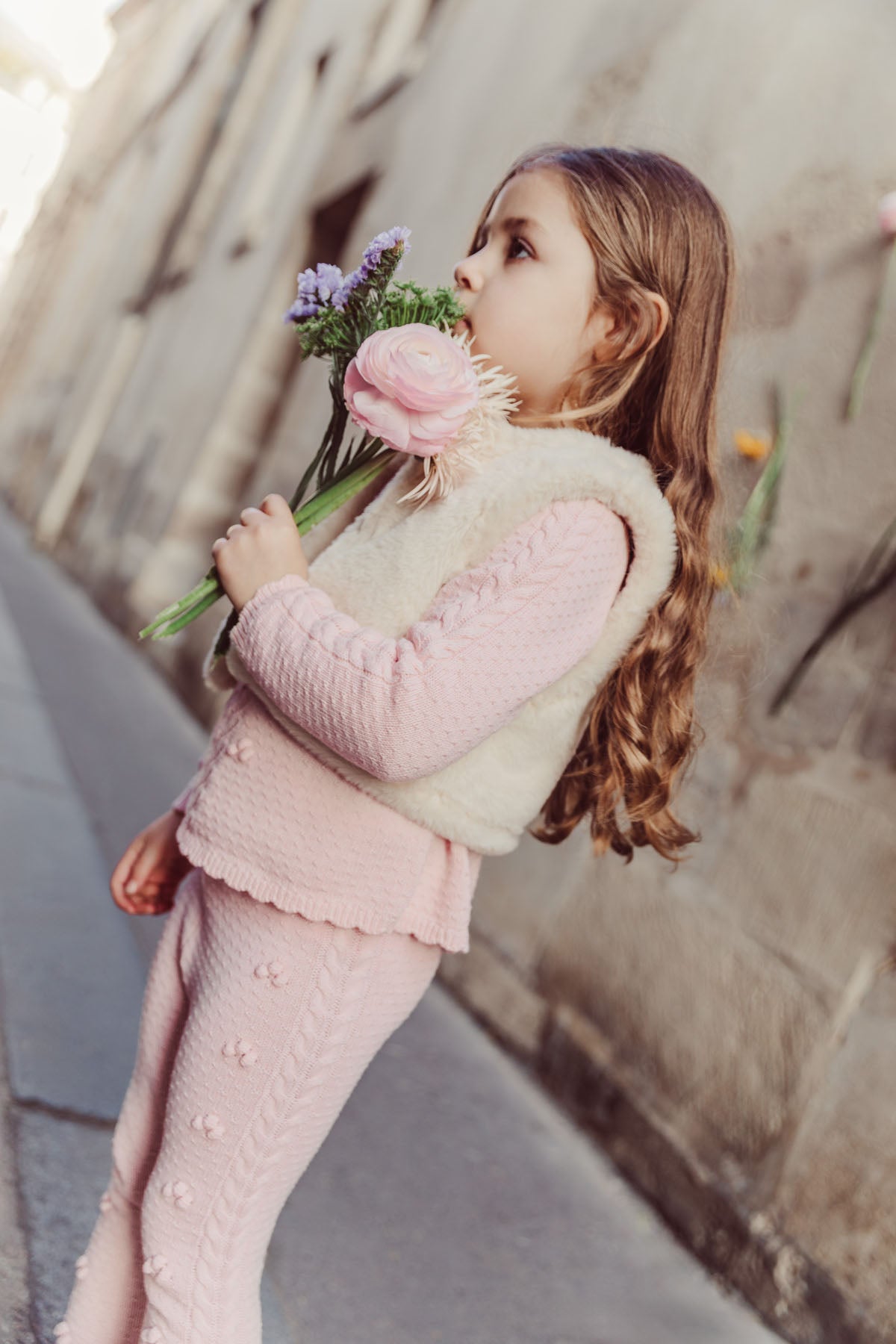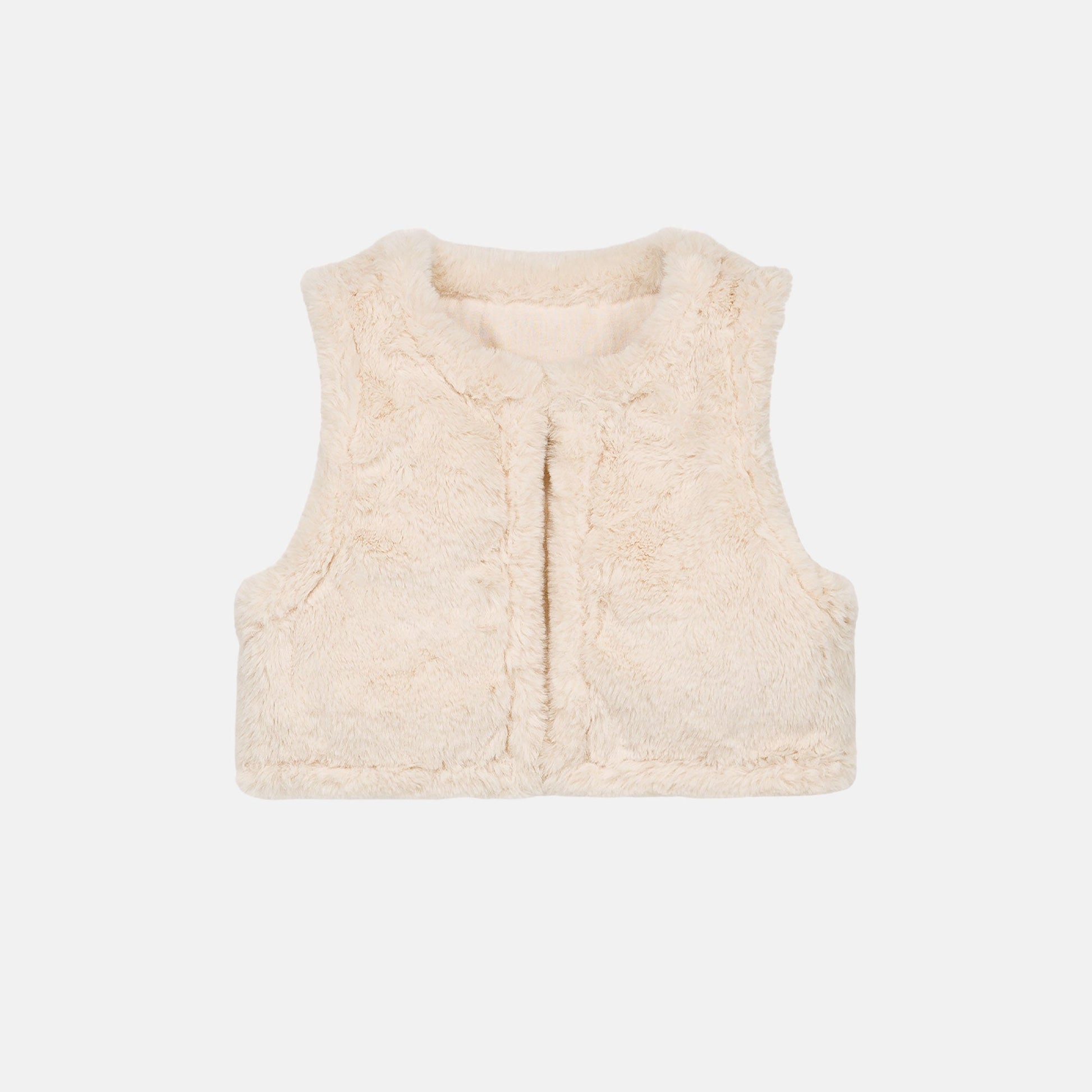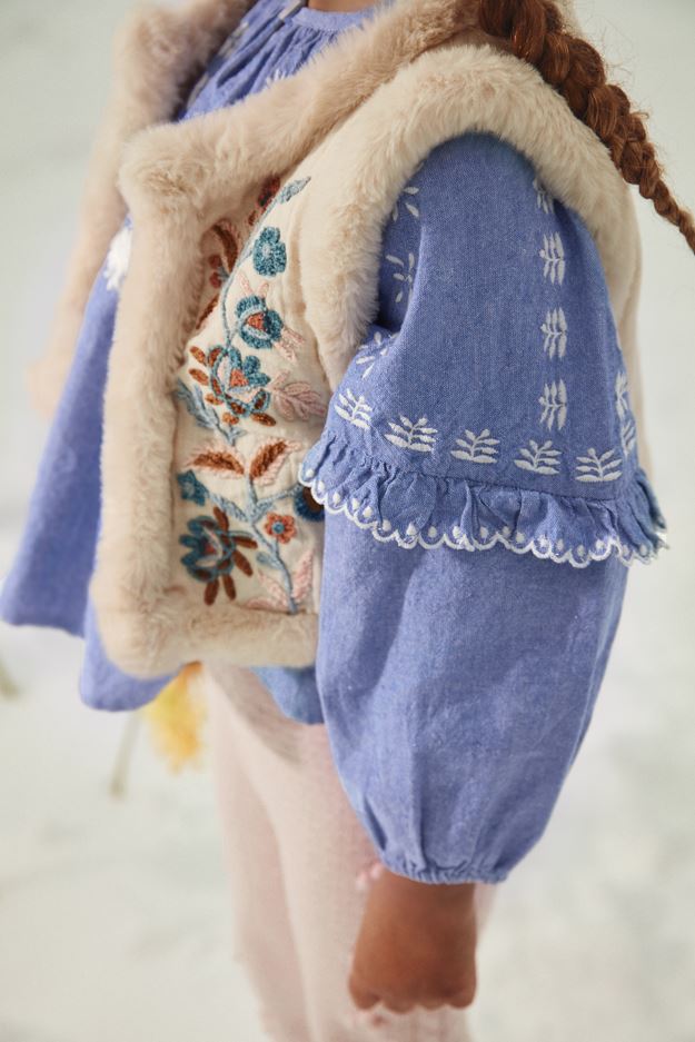 One side in embroidered cotton gauze, and one side in soft faux fur.