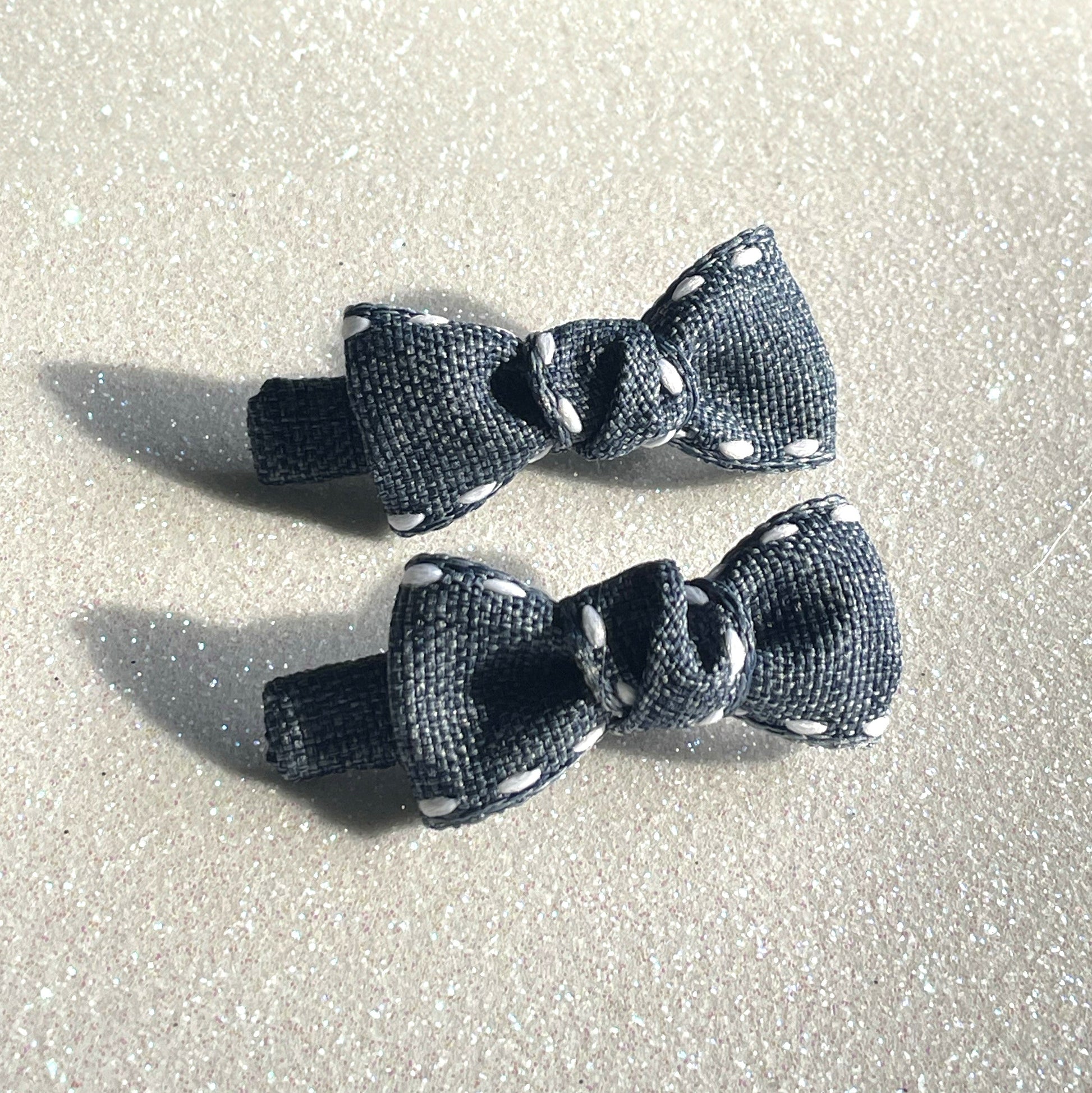 A mini bow made from structured denim, featuring contrast stitching that brings to mind the charm of classic blue jeans. Lightweight and timeless — perfect for adding a touch of playful texture.